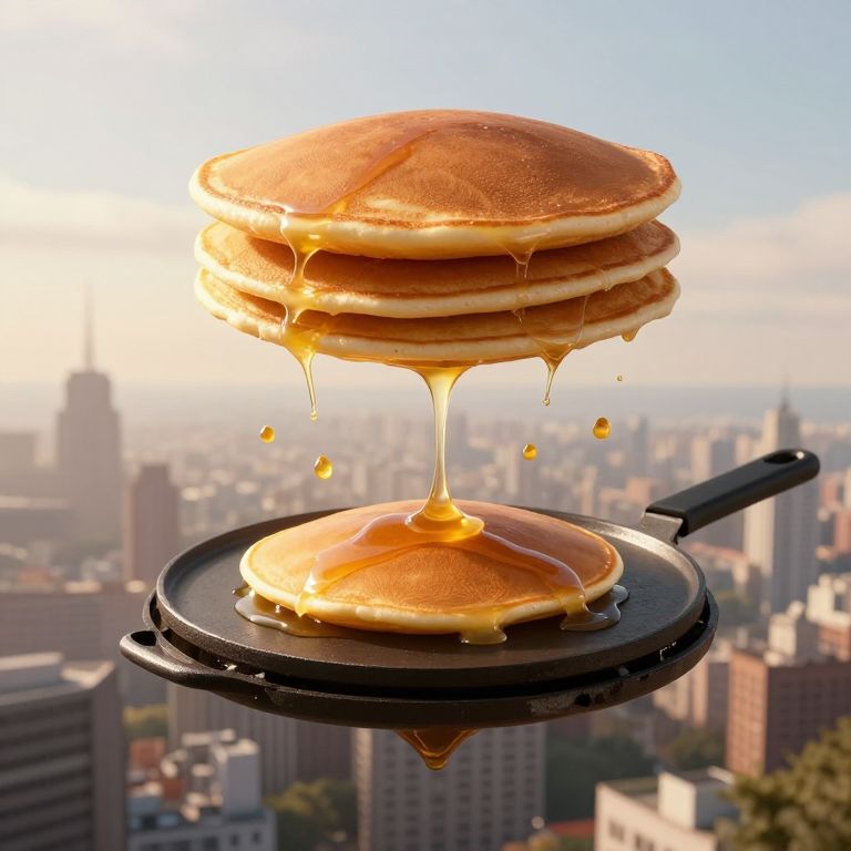 Amidst the hushed whispers of a city awaking, a colossal griddle suspended in the heavens rains golden pancakes, symbolizing the surreal intersection of dreams and reality, where the mundane is elevated by the extraordinary.