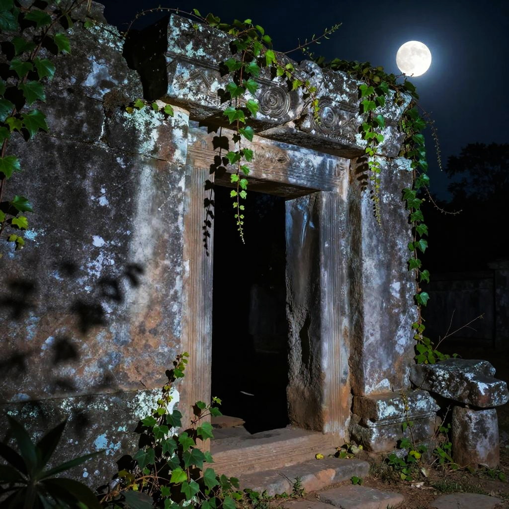 Hiding naked behind ancient stone ruins under moonlight, silver glow casting shadows, ivy creeping over weathered surfaces, sense of vulnerability and secrecy