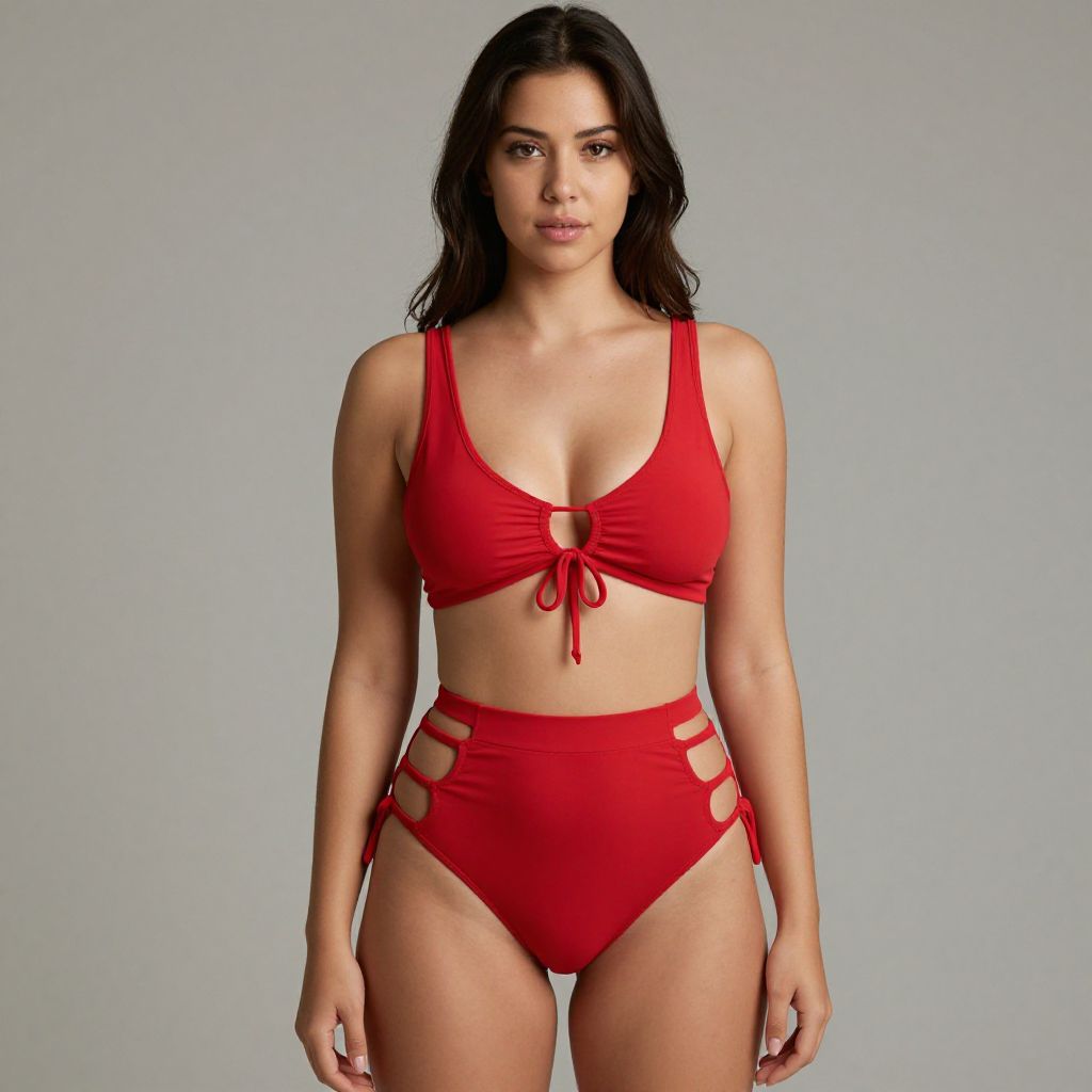 "Woman, contemporary swimwear, solid red two-piece bikini, scoop neck top with triple cut-out detail and tie at the chest, high-waisted bikini bottoms with coordinating triple cut-out and tie detail at the sides, minimalist style, plain background.. Sexy. Pretty face and beаutiful eyes. Big breasts."