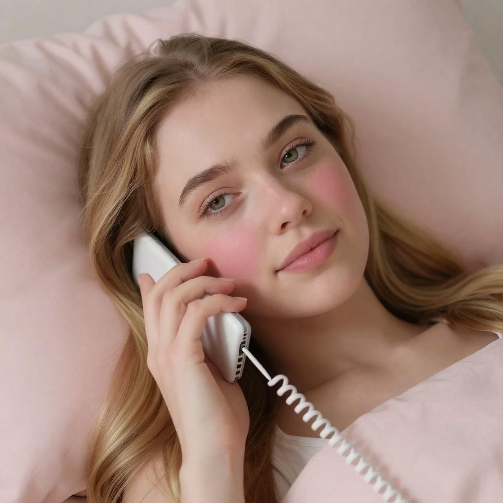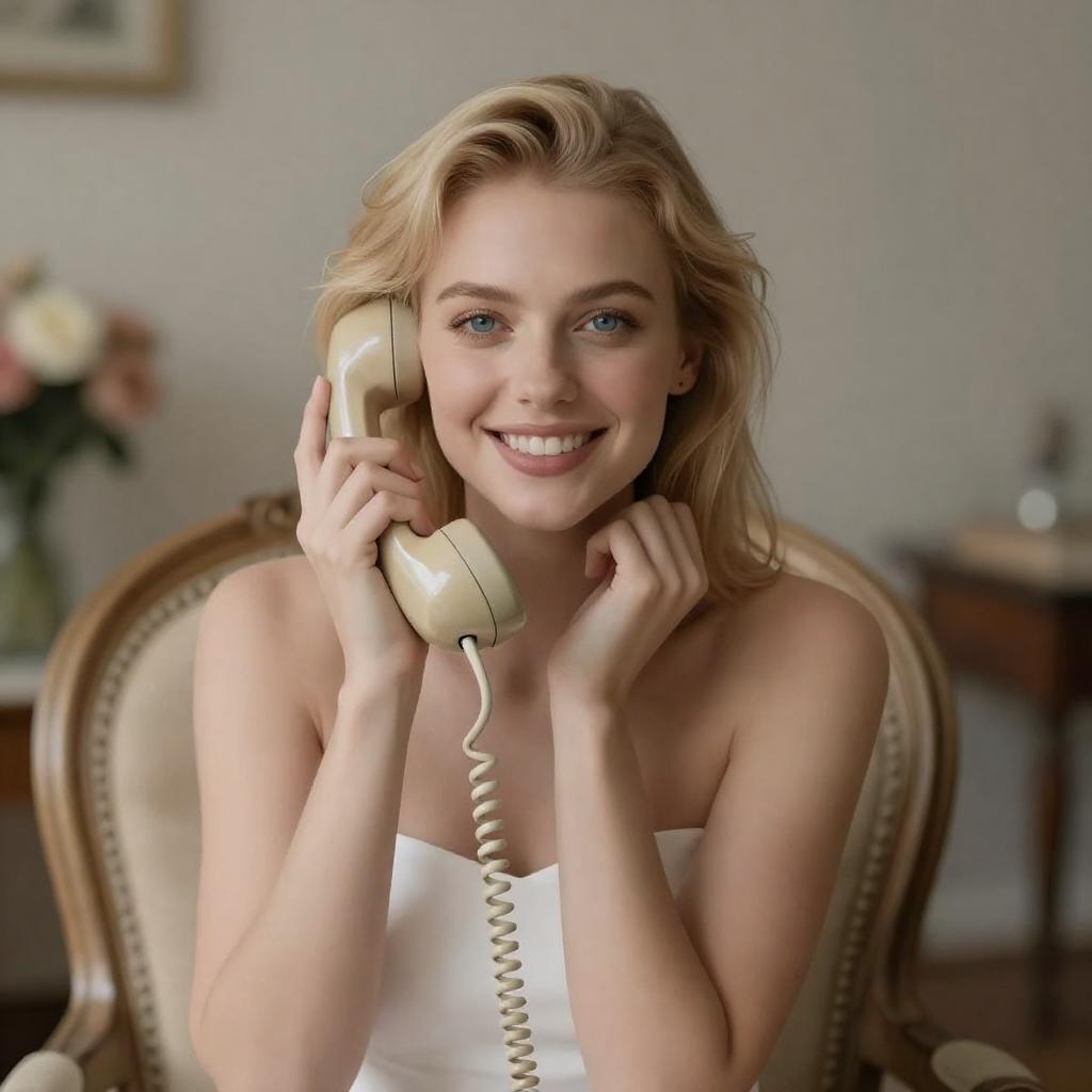 Blonde woman with blue eyes, smiling, holding vintage beige telephone, sitting on elegant chair, white strapless top, blurred floral background, soft lighting, warm colors.
