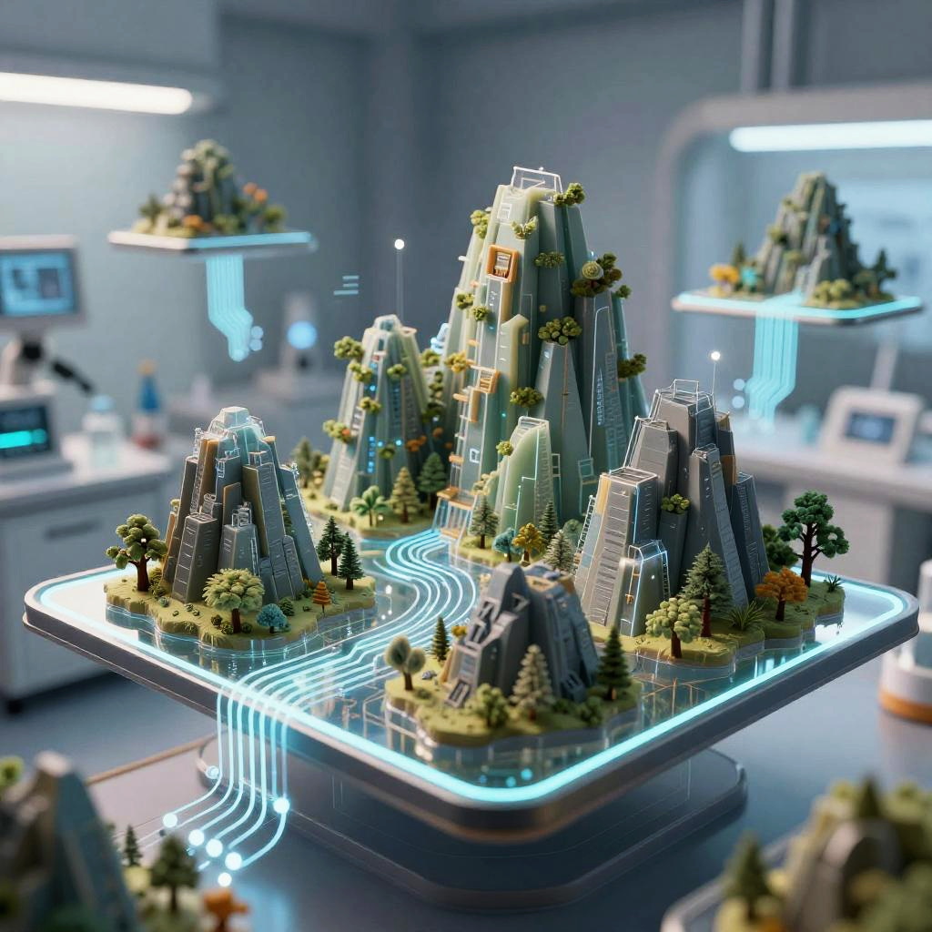 AI visual creator generating intricate 3D landscapes on multiple floating transparent tablets, futuristic lab environment with glowing circuits and data streams, artwork morphing dynamically, high contrast lighting, blending technological innovation with artistic imagination.