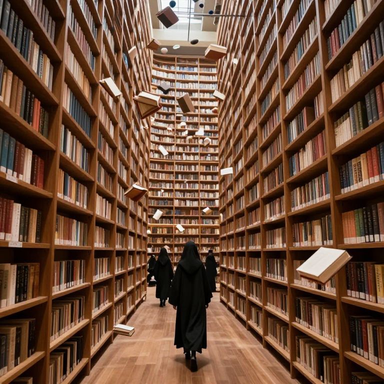 In a gravity-defying library, books float effortlessly through the air like celestial bodies, while cloaked figures walk through endless rows of shelves as if traversing a dreamy, otherworldly corridor.