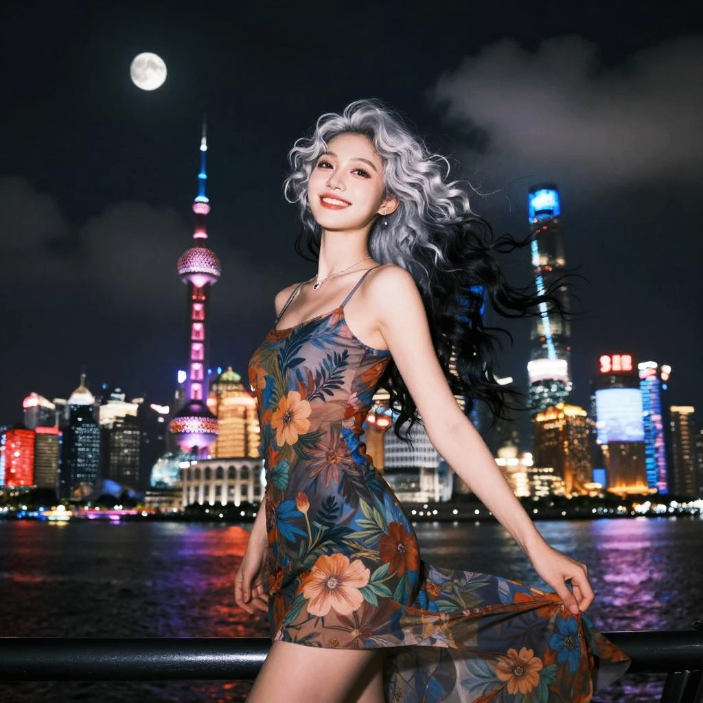 Realistic, photorealistic, masterpiece, best quality, dark shot, (photo of portrait:1.2), cowbody shot, 1girl, silver hair, long curly hair, solo, smile, looking at viewer, long black hair, ([:see-through:4]:1.2) (colorful:1.2) cns_dress, (floral print:1.2), standing by a river, dynamic pose, (shanghai:1.2), water, colorful cloud, incredible beautiful sky, netural lighting, dynamic Angle, neon, moon, bokeh, Chiaroscuro