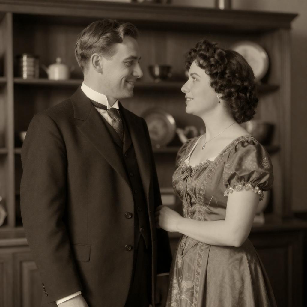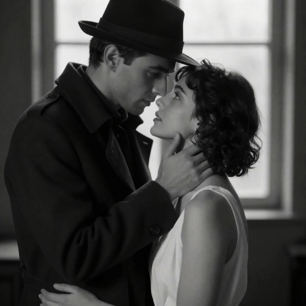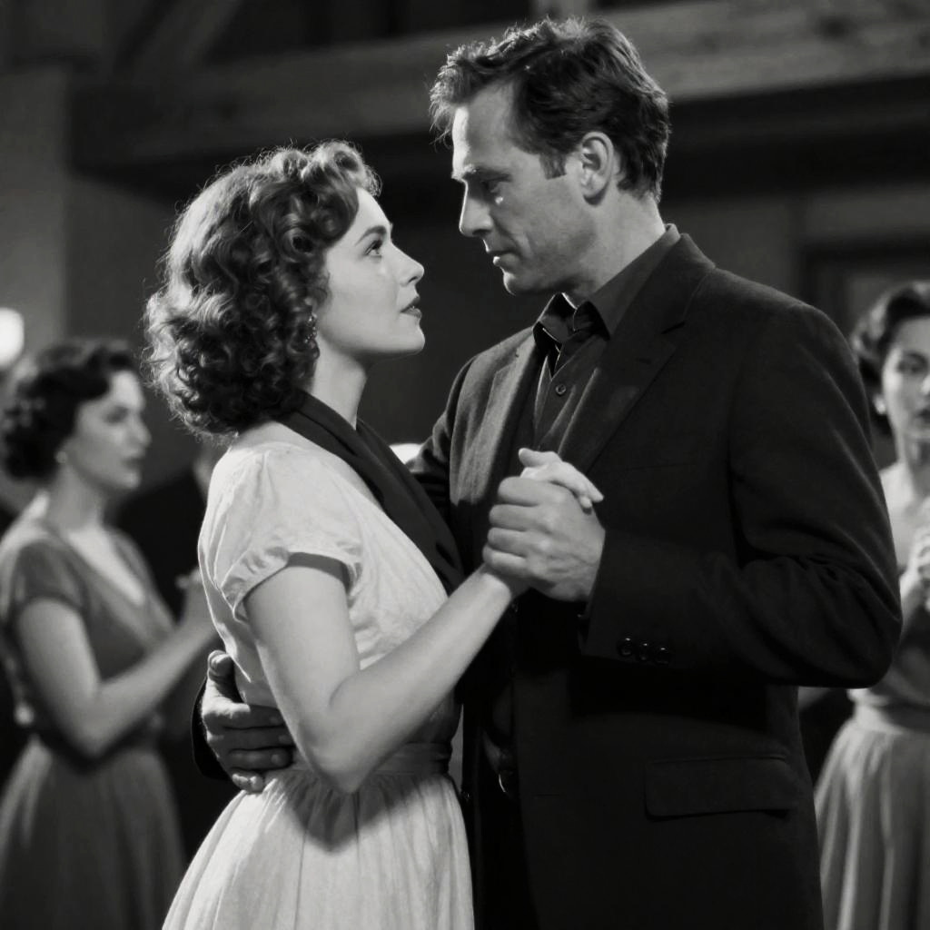Black and white movie poster of a man and woman dancing closely. The man wears a dark, long-sleeved jacket and looks down at the woman. She has curled hair, wears a light-colored dress with a dark scarf, and looks up at him. Background includes wooden beams. The man's right hand holds her left hand, while his left hand rests on her waist. Both have serious expressions. Two additional women are partially visible in the background.