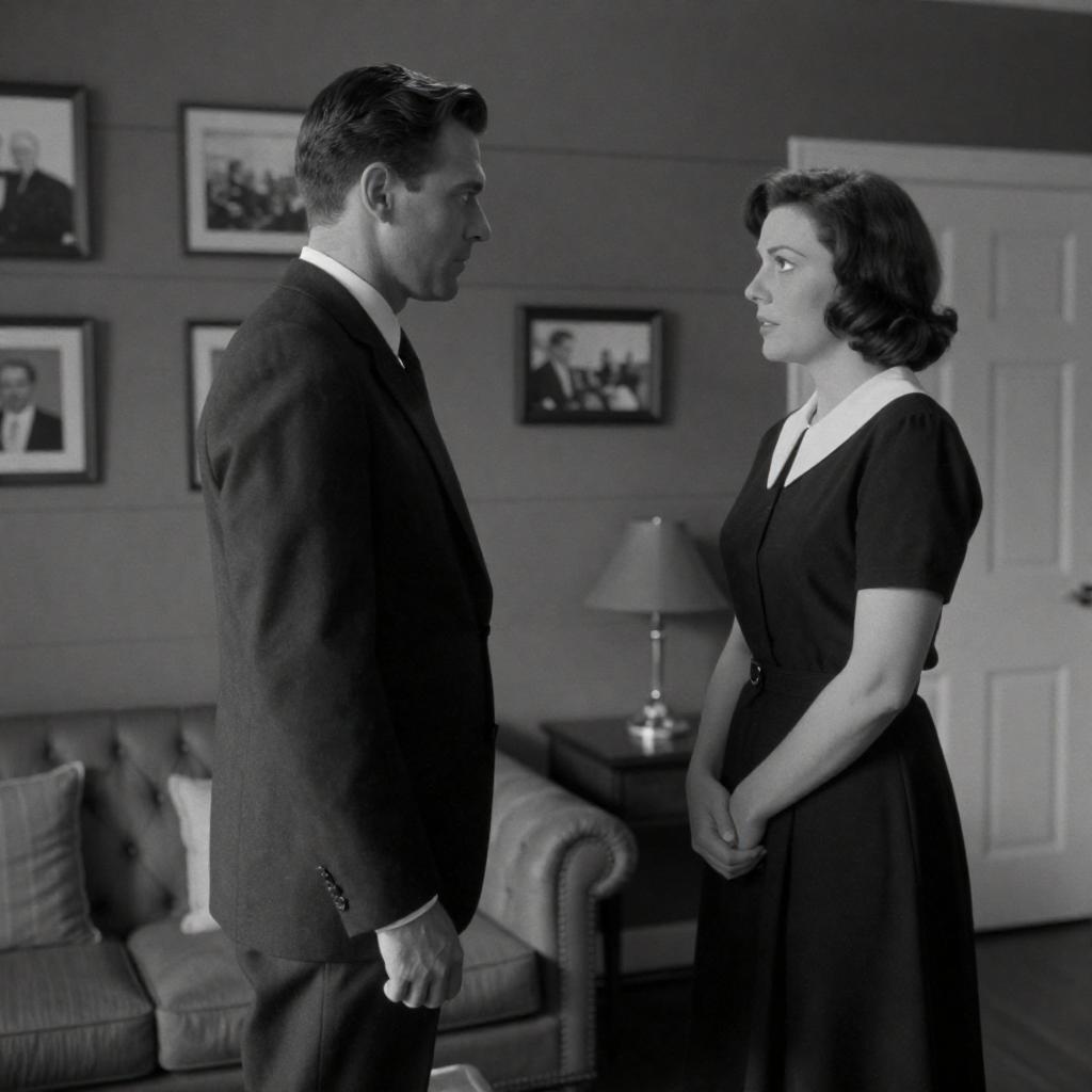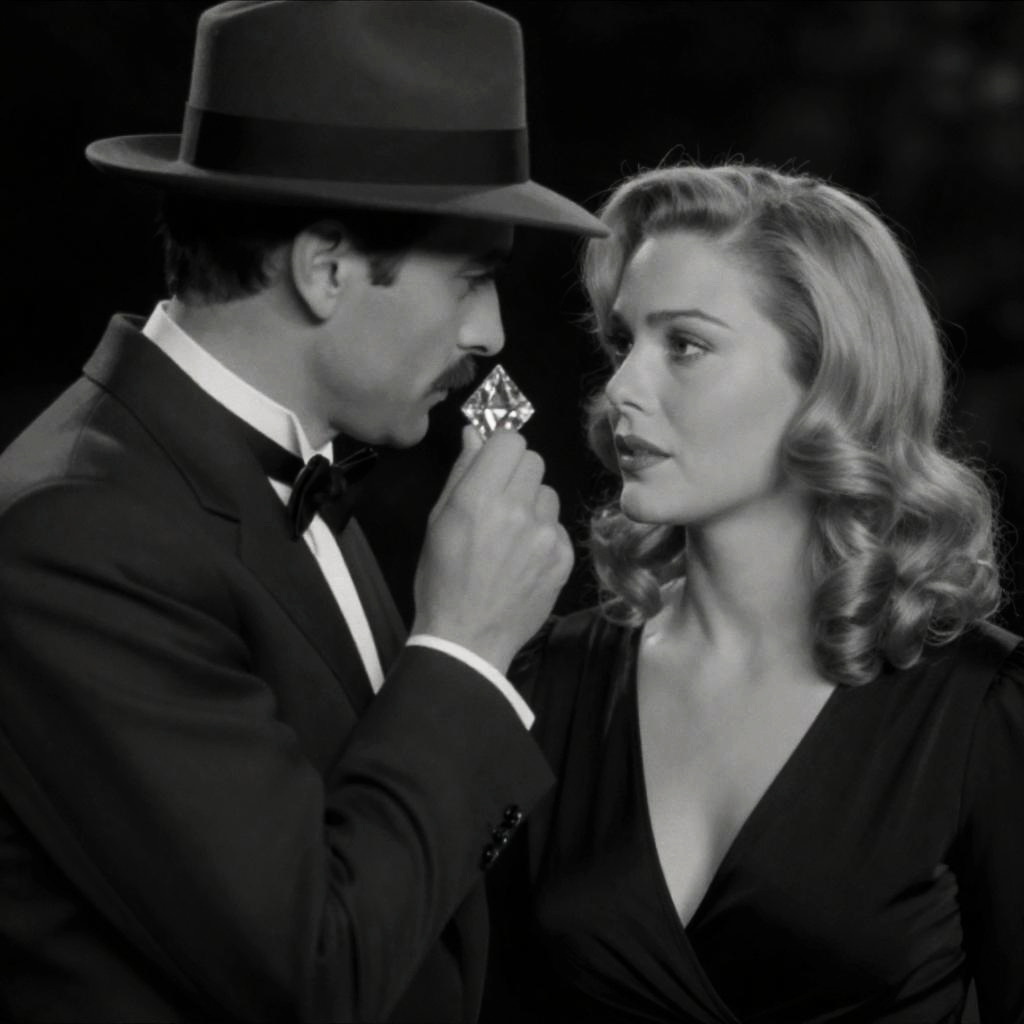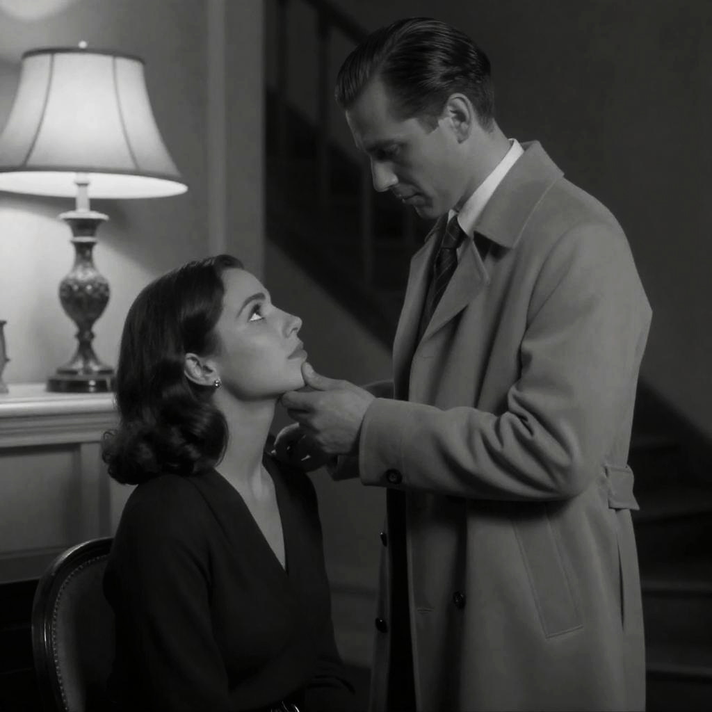 Black and white movie poster of a man and woman dancing closely. The man wears a dark, long-sleeved jacket and looks down at the woman. She has curled hair, wears a light-colored dress with a dark scarf, and looks up at him. Background includes wooden beams. The man's right hand holds her left hand, while his left hand rests on her waist. Both have serious expressions. Two additional women are partially visible in the background.