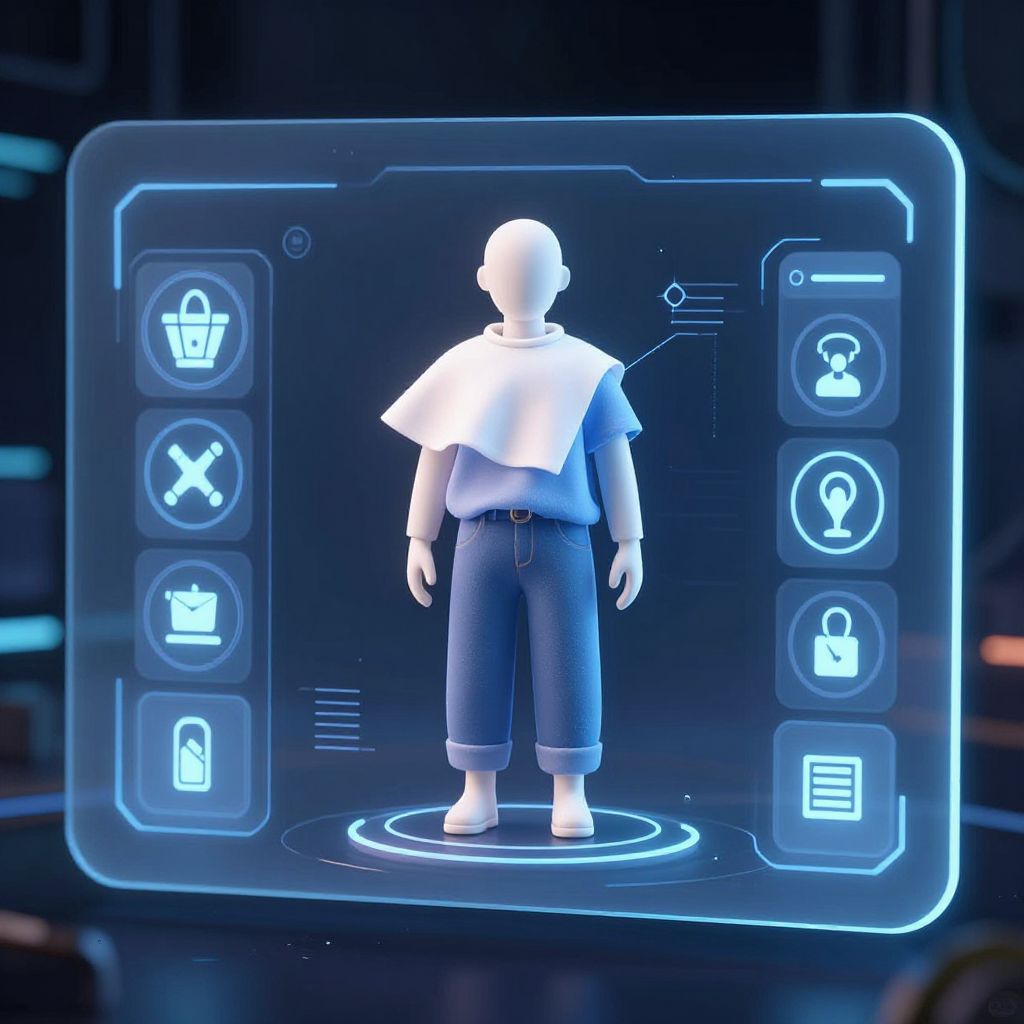 AI cloth remover interface on a transparent touch screen panel, showing layered clothing removal process from a 3D model, sleek UI design with glowing lines and futuristic icons, cyberpunk-inspired background, highly detailed