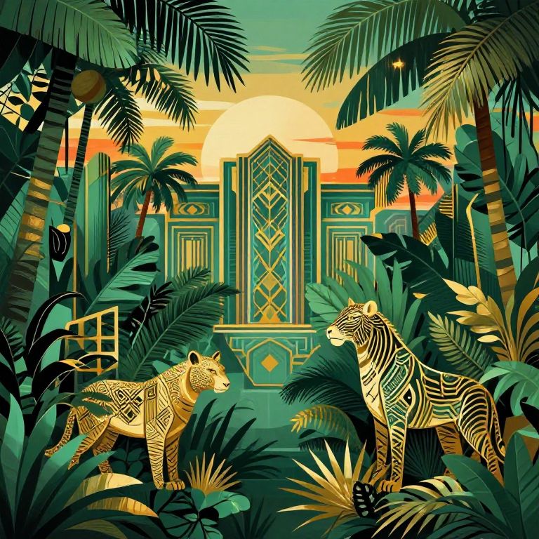 Art deco jungle scene with vibrant geometric patterns, lush tropical foliage in emerald and gold, exotic animals stylized with sharp angular lines, vintage 1920s style architecture peeking through dense leaves under a sunset sky, intricate and opulent design.