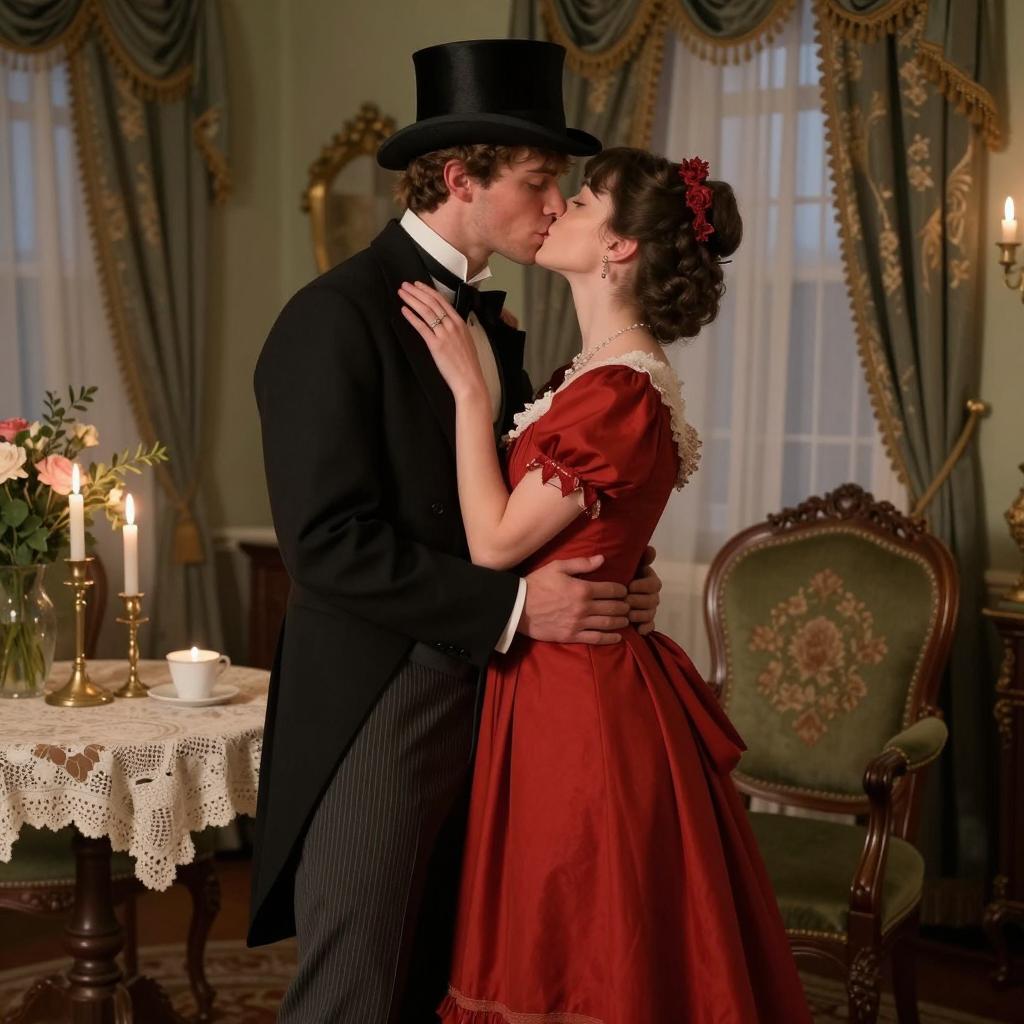 Couple kissing in a richly decorated Victorian-style room. Man in black suit, top hat, and white shirt, woman in long red dress. Green armchairs, lace tablecloths, candles, plants, and ornate curtains. Man's right hand on woman's waist, woman's left arm around his neck. Intense, close-up kiss. Two people. Warm, dim lighting. Detailed, vintage decor.