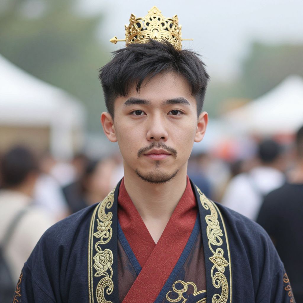 "man festival attire costume, 1boy, solo, male focus, black hair, blurry background, blurry, looking at viewer, facial hair, mustache, upper body, asian, realistic, crown, chinese clothes Realistic photo of casual sexy person with pretty face"