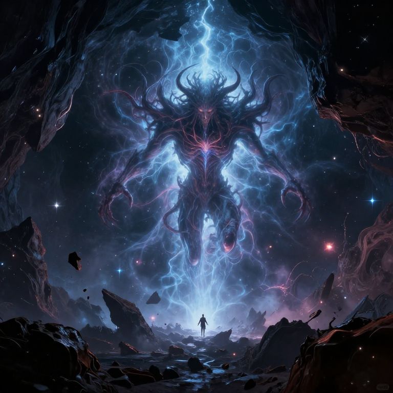Digital fantasy artwork depicting a colossal, ethereal creature with glowing blue and purple lightning-like tendrils, and a menacing, horned face. The creature looms over a small, silhouetted human figure standing on a rocky, star-filled landscape. The background is a dark, cosmic expanse with swirling clouds and scattered stars, creating a dramatic, otherworldly atmosphere. The creature's luminescent energy contrasts sharply with the dark, jagged rocks and the surrounding void, emphasizing its formidable presence. The image conveys a sense of awe and danger.