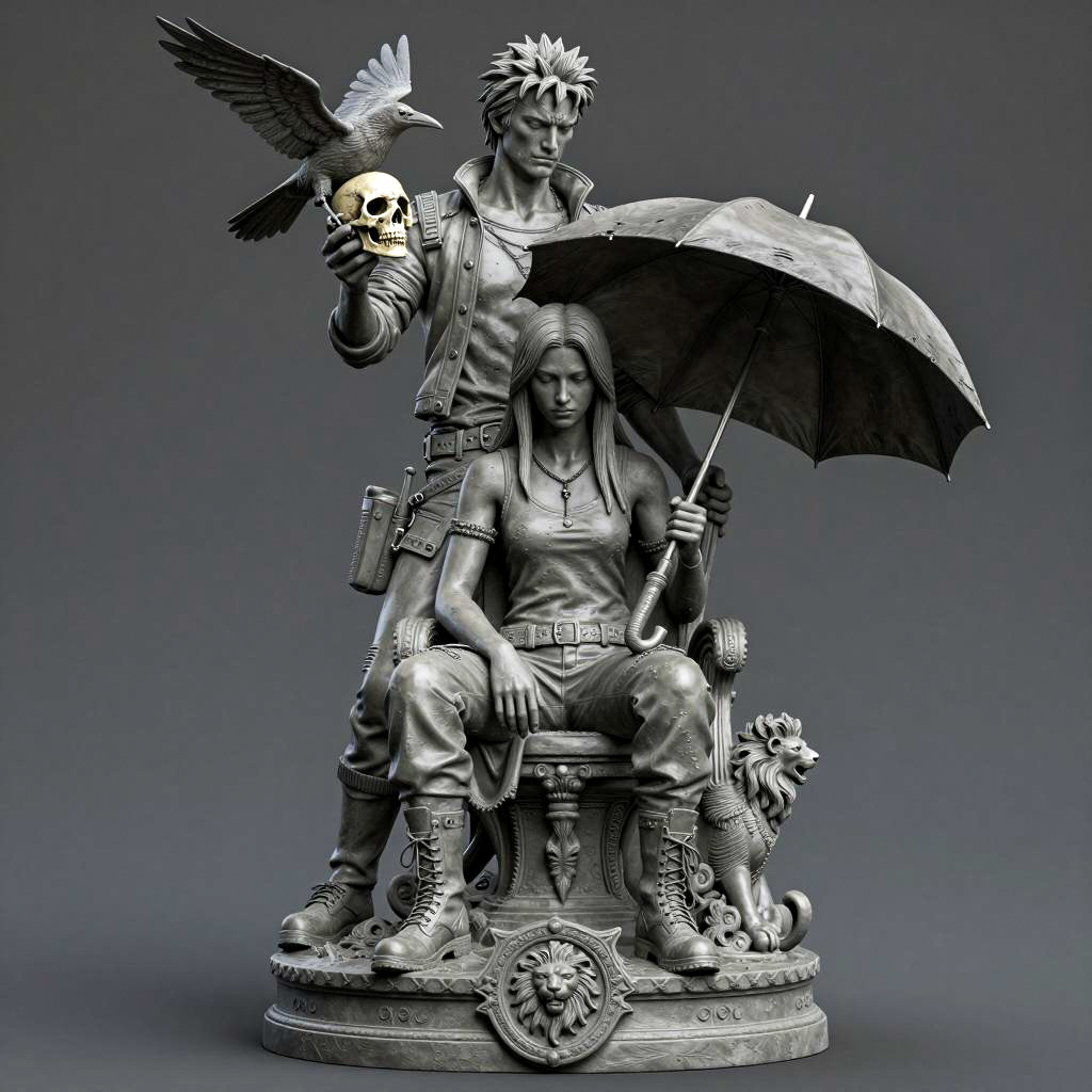 Detailed statue of two characters. Male stands behind female, holding a skull and a crow on his shoulder. Female sits in front, holding an umbrella, wearing a tank top, pants, boots. Both have dark, rugged clothing and intense expressions. Male has spiky hair, female has long, straight hair. Base has ornate designs and a lion emblem. Dark, grayscale color scheme. Realistic, sculpted style.