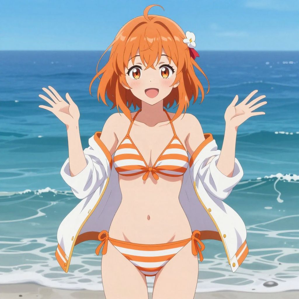 Digital artwork of an anime girl with orange hair wearing an orange and white striped bikini with a white jacket featuring orange accents. She is smiling and standing with her hands raised against a background of a blue ocean with waves.