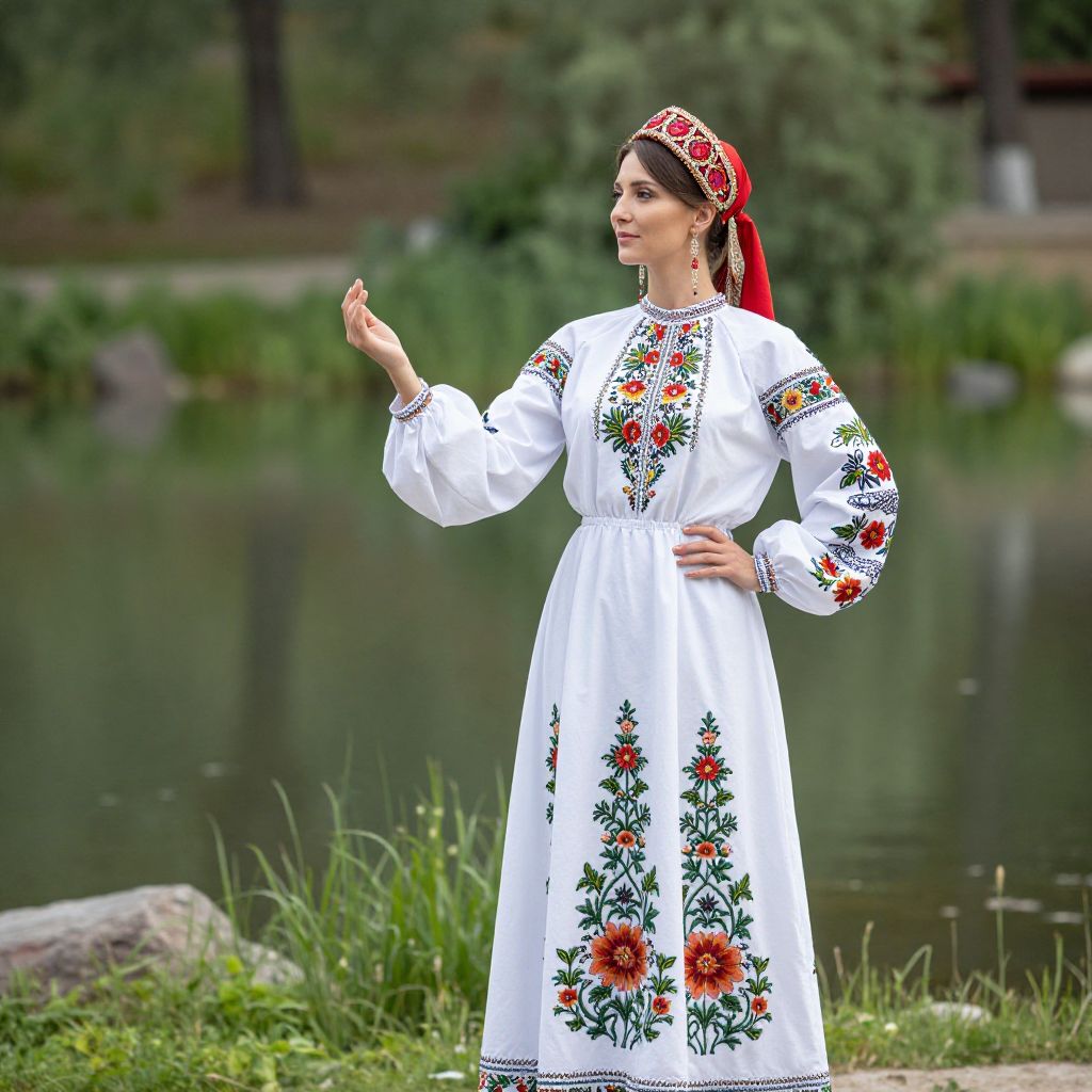 Woman wearing a traditional Moldovan outfit stands gracefully by a serene pond, her ensemble featuring intricate embroidery, voluminous sleeves, and a vibrant red headpiece that complements her flowing dress adorned with floral patterns.
