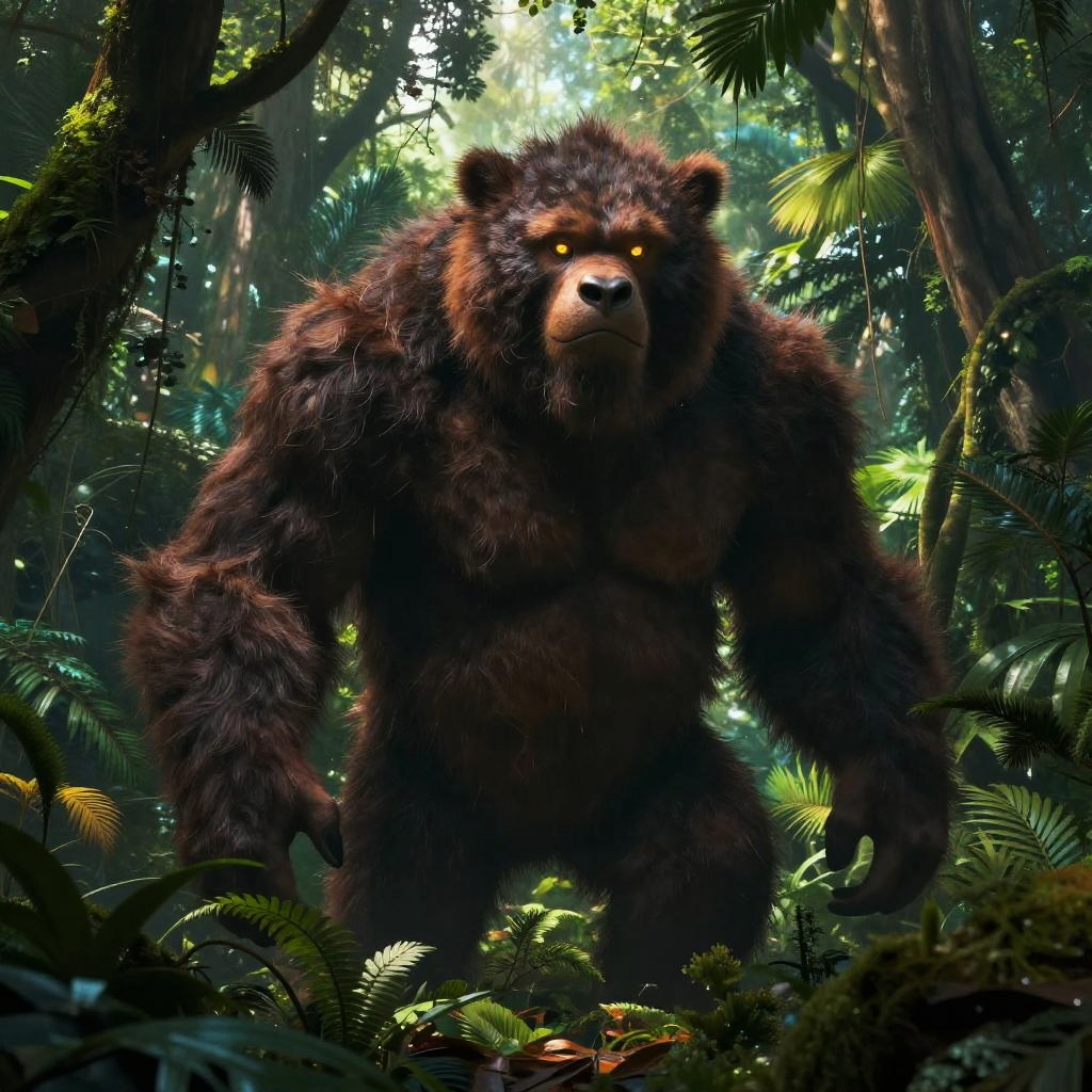 Giant furry creature roaming a misty ancient forest, towering over giant trees with soft fur gleaming under dappled sunlight, mystical atmosphere, high detail, fantasy realism, subtle magical glow
