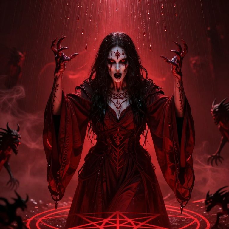 Digital artwork of a dark-haired woman in a tattered dress, glowing red orbs in hands, facing a skeletal, ghostly figure under a moonlit