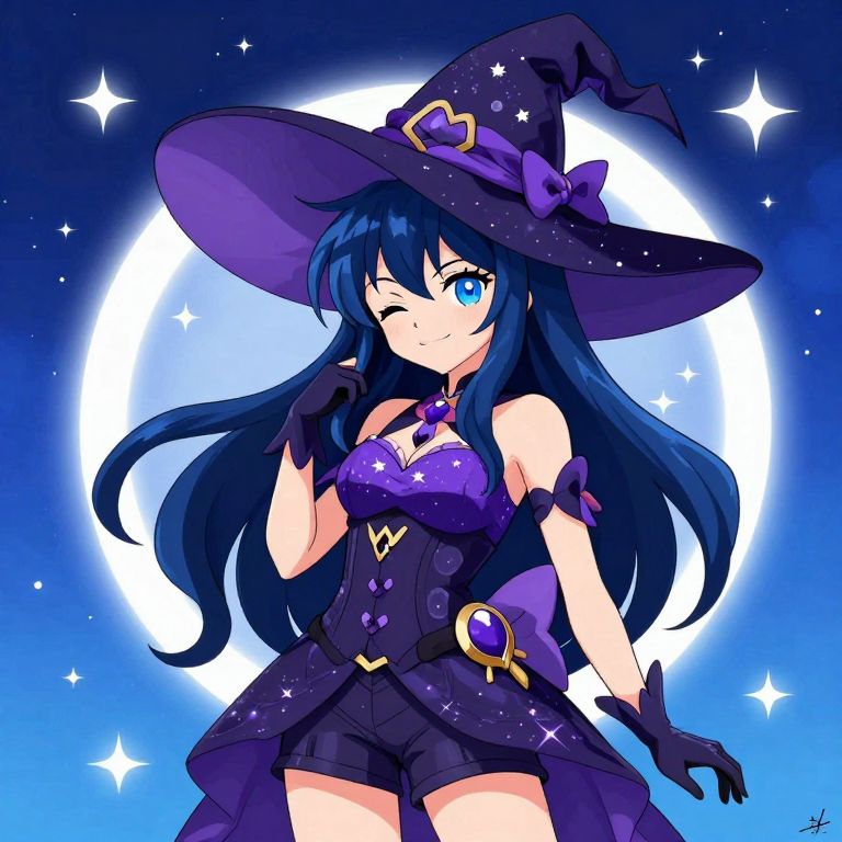 Anime-style digital drawing of a blue-haired witch with large hat, purple outfit, and star patterns, winking against a glowing full moon.