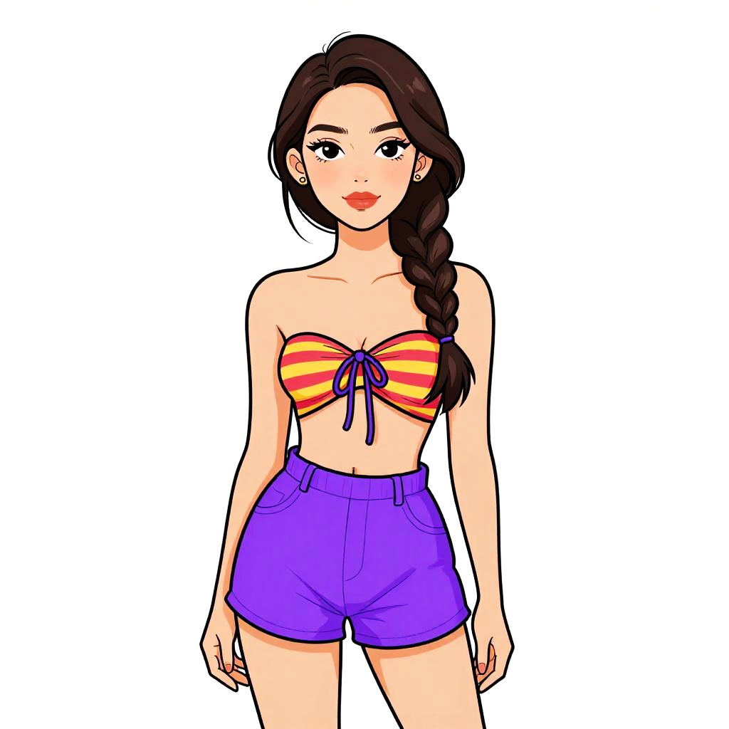 Woman with pretty face and pretty hair. Woman, modern swimwear, monochromatic striped one-piece with cut-out midriff, sleeveless, high-neck with black collar, three ornamental buttons down the center front, black trim, photo studio background --sref 1467