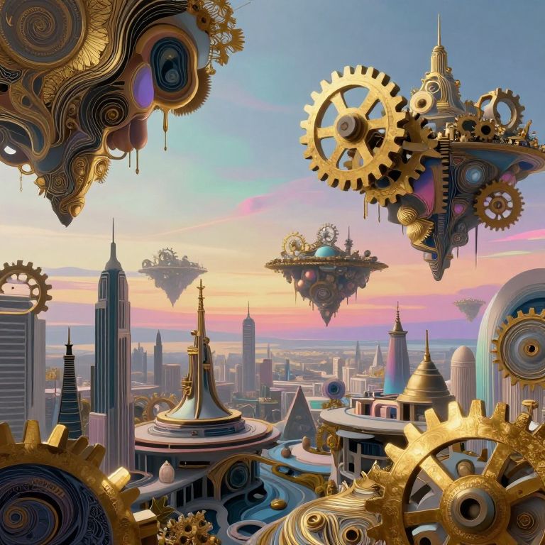 A surrealistic landscape depicting an ethereal meeting of ocean and sky, where waves of molten gold seamlessly merge into a star-filled cosmos. In the foreground, a colossal tower stands still, its intricate gears and frozen hands contrasting with whimsical floating islands adorned with lush vegetation in the background. This dreamlike scene captures a harmonious blend of awe and tranquility, inviting exploration into the rich emotional narrative hidden within.