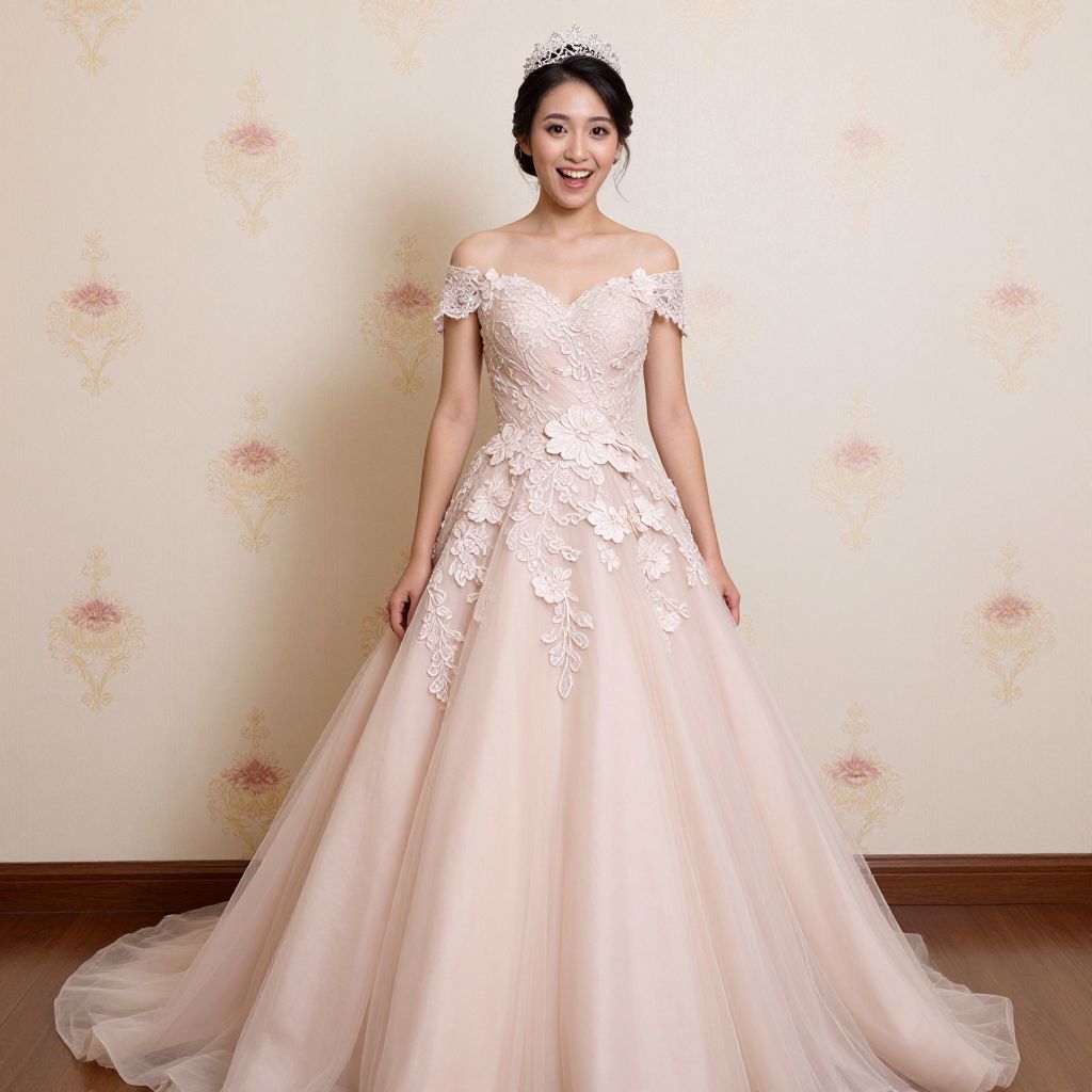 Photograph of an Asian woman with fair skin and dark hair, styled in an elegant updo adorned with a tiara. She is wearing an off-the-shoulder, white lace wedding gown with intricate floral patterns, a fitted bodice, and a full, flowing skirt. She stands against a cream-colored wall with subtle floral patterns, smiling warmly. The gown's lace details and smooth satin fabric contrast beautifully with the soft, warm background. The floor is wooden, adding a touch of natural texture to the scene.