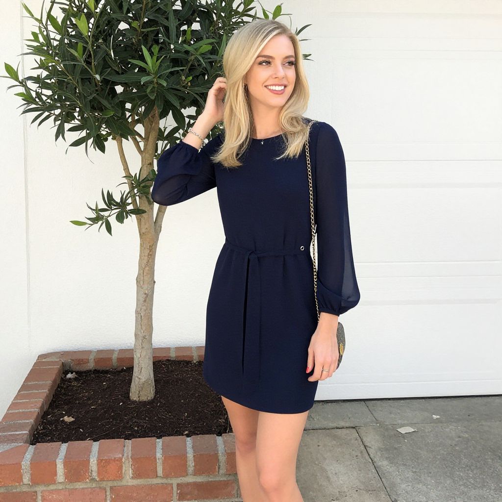 Blonde woman standing outdoors in front of a white wall, wearing a navy blue long-sleeve dress with sheer sleeves and a gold chain purse, smiling while leaning against a small tree planted in a brick planter filled with dark soil and green foliage.