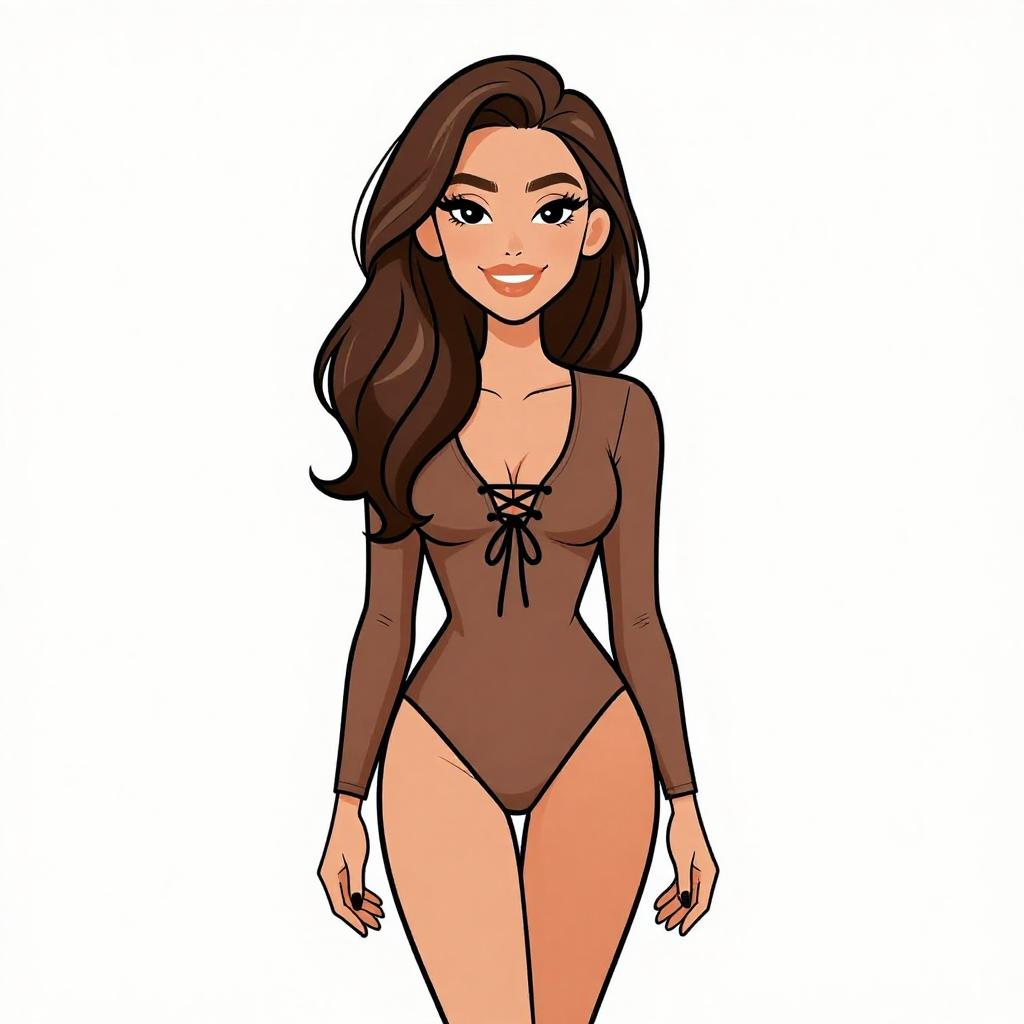 Woman with pretty face and pretty hair. smiling Woman, casual, long-sleeve bodysuit in a solid brown tone, deep v-neck with crisscross lace-up detail, fitted silhouette, high-cut leg openings. --sref 1467