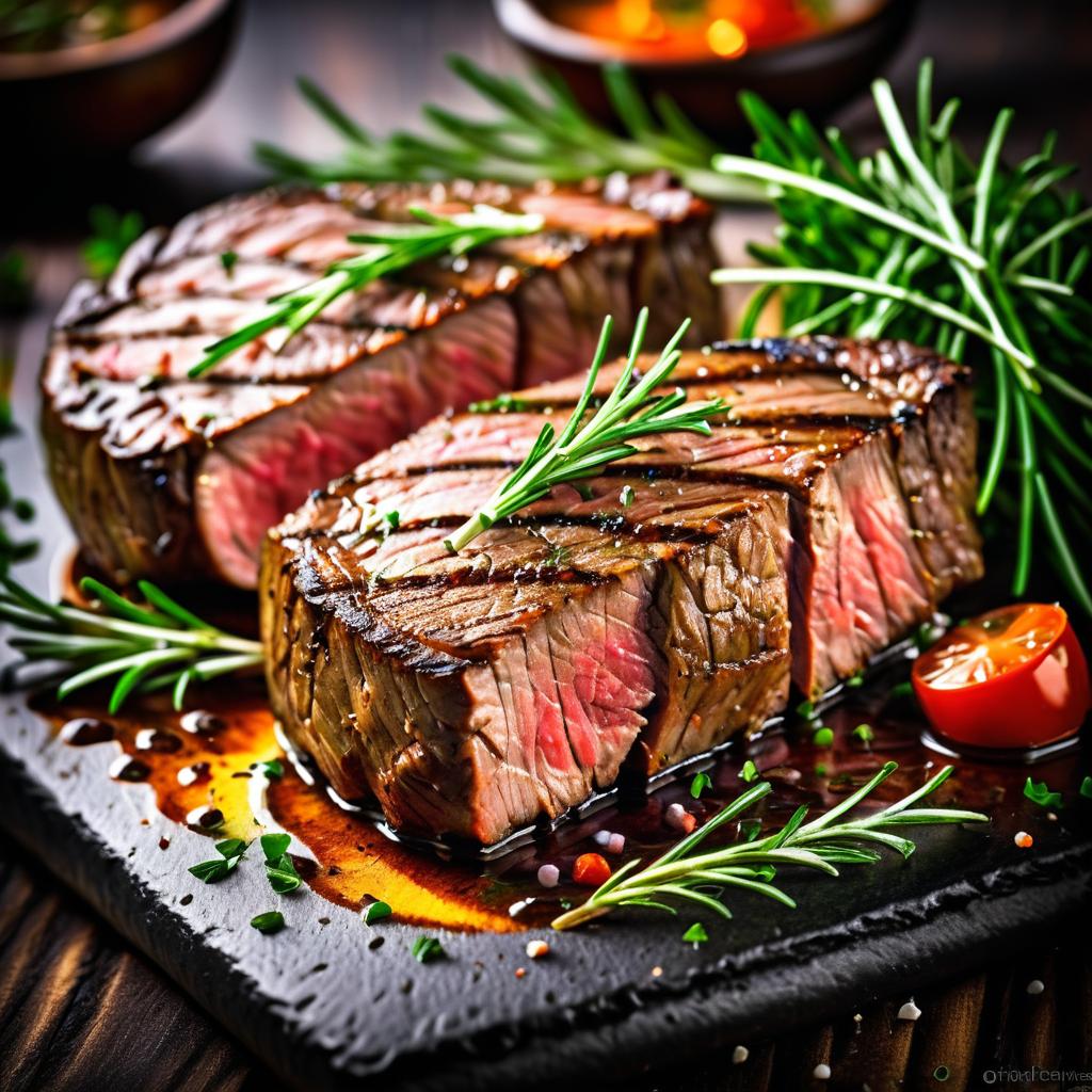 Close-up of a perfectly grilled medium-rare steak garnished with fresh rosemary and finely chopped herbs. The steak is presented on a black plate with a rich, flavorful juice surrounding it. Two ripe cherry tomatoes add a pop of color to the vibrant and detailed gourmet food photography.