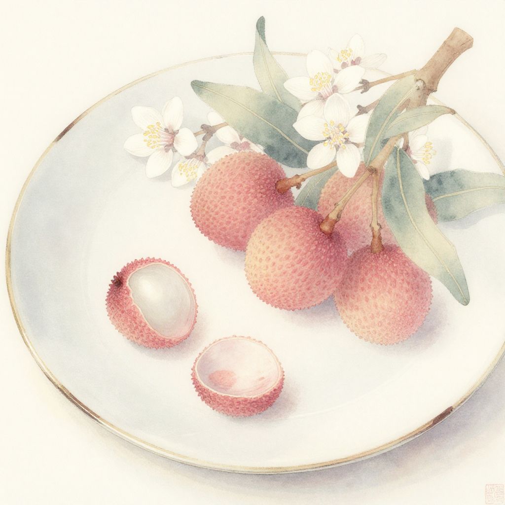 Artistic composition of lychee fruits and blossoms arranged on a vintage ceramic plate, soft pastel color palette, delicate brush strokes reminiscent of traditional Asian watercolor paintings, focus on elegance and natural beauty of lychee.