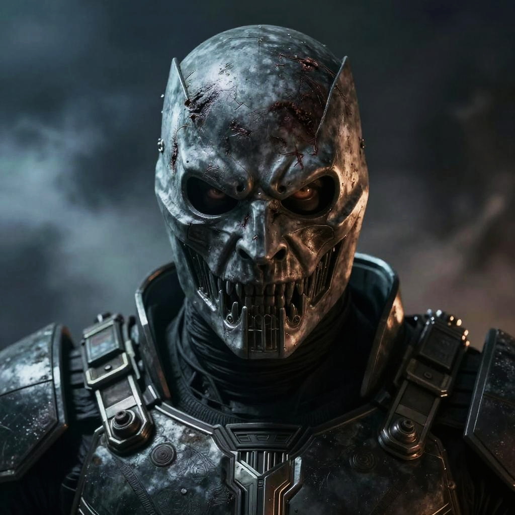 CGI image of a menacing, metallic skull-faced warrior with glowing eyes, dark armor, and futuristic design, set against a smoky, blue-gray