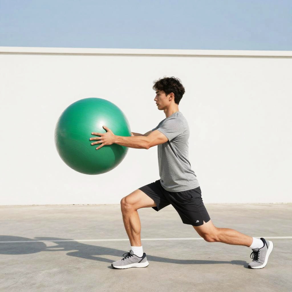 A young athletic man in casual workout clothes performing a lunge exercise while holding a large green exercise ball, outside against a plain white wall, clear sky and daylight, natural lighting with soft shadows, modern minimalistic urban setting