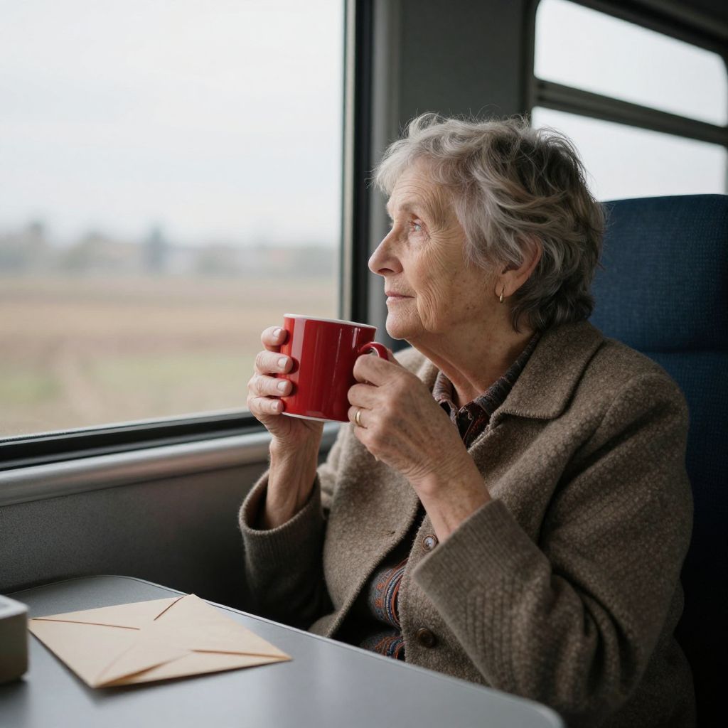 Photograph of an elderly woman with short, gray hair, sitting in a train's window seat. She wears a brown, textured wool coat and holds a red ceramic mug to her lips, sipping. Her skin is wrinkled, and she wears small, gold earrings. The background shows a blurred, outdoor landscape through the train window. On the gray table in front of her, there is a beige envelope. The lighting is soft, highlighting her profile. The scene conveys a sense of quiet reflection.
