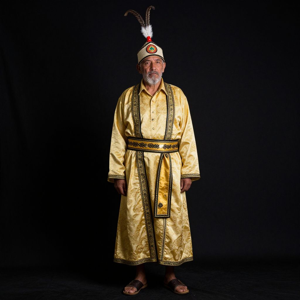 Photograph of an elderly man with a gray beard standing against a black backdrop. He's wearing an ornate, yellow traditional outfit with a wide sash and black trim, accompanied by a tall, feathered hat. The hat has a colorful emblem on it. He's also wearing dark sandals. The lighting highlights his outfit, casting soft shadows around him.