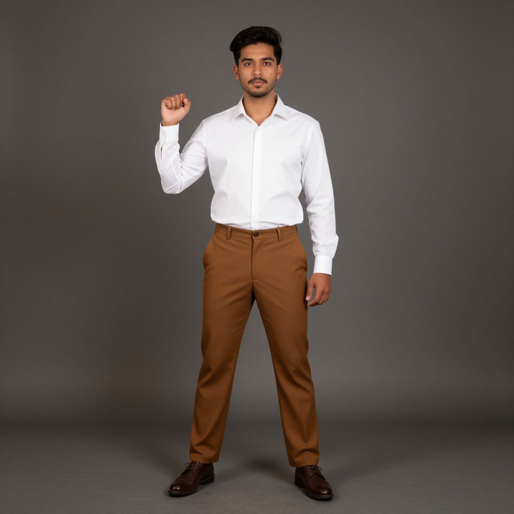 Photograph of a young Indian man with short black hair and a trimmed beard, standing confidently against a plain gray background. He is wearing a crisp white long-sleeved dress shirt, buttoned up, and brown trousers with a belt. His right fist is raised in a punch, showcasing a determined expression. He has a medium build and is wearing polished black dress shoes. The lighting is even, highlighting his attire and the neutral background. The overall style is professional and formal.