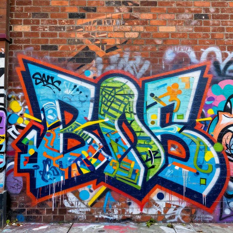 Picture of graffiti on an urban brick wall, vibrant colors with intricate patterns and street art style, bold tags and mural designs blending abstract shapes, dynamic lighting highlighting texture and paint drips, gritty city atmosphere, high detail.