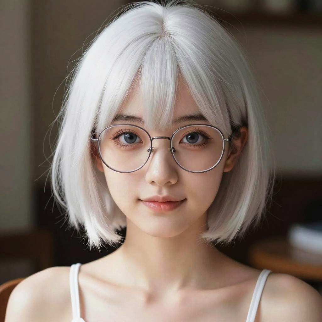 Best quality, masterpiece, illustration, an extremely delicate and beautiful, extremely detailed, CG, unity, 8k wallpaper, Amazing, finely detail, extremely detailed CG unity 8k wallpaper, huge filesize, ultra-detailed, highres, beautiful detailed girl, extremely detailed eyes and face, beautiful detailed eyes, light on face, 1girl, aespakarina, (ultra-detailed), (best illustration), (best shadow), ultra-high res, (realistic, photo-realistic:1.2), realistic face proportions, slender, smile, (makeup:0.4), (full body, sitting), ((puffy eyes)), looking at viewer, (bokeh:1.4), ((glasses)), ((short white hair)), ((messy hair))