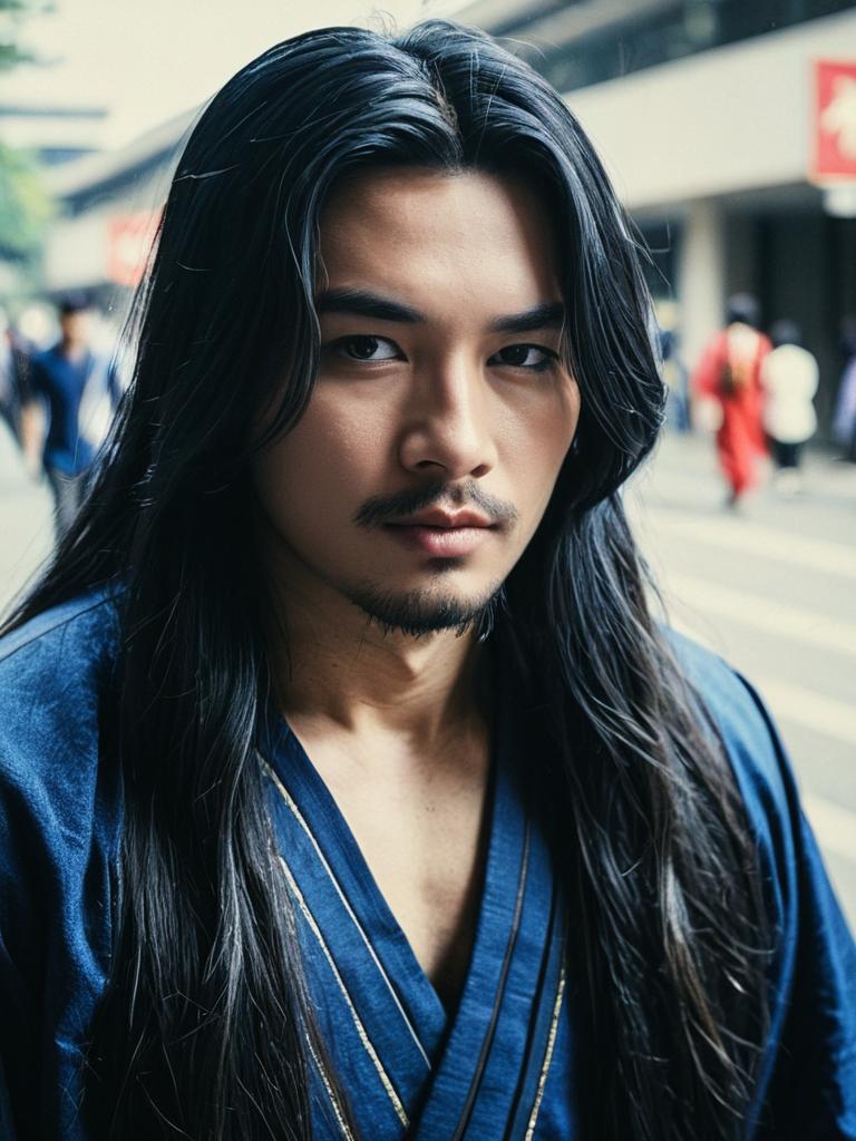 Man in Asian Long Hair costume, photorealistic cosplay portrait, cinematic realism