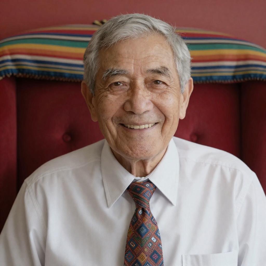 Photograph of an elderly man with gray hair and wrinkled skin, smiling broadly. He wears a white shirt with vertical stripes and a colorful patterned tie. He sits against a red upholstered chair with a multicolored striped blanket draped over the top. His facial expression is warm and friendly. The background is a plain red surface. The man is centered in the frame, looking directly at the camera.