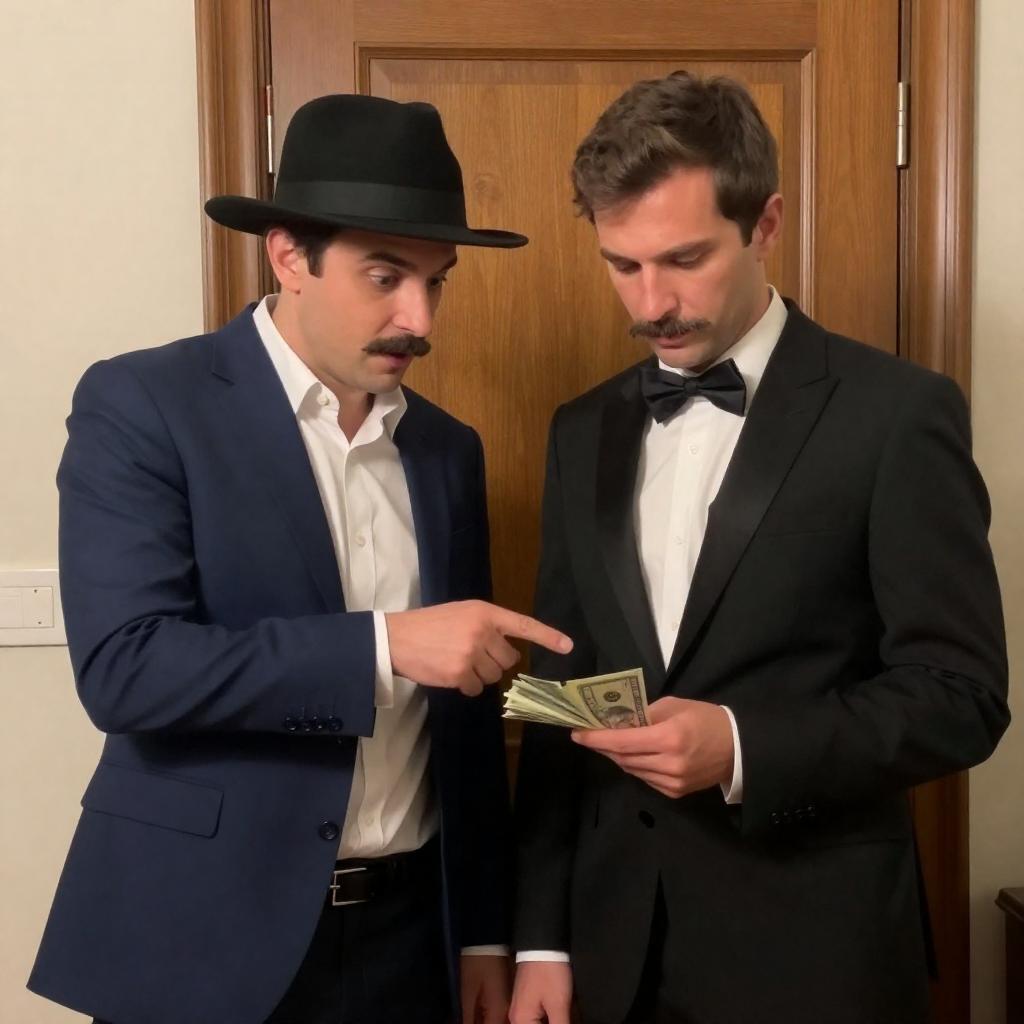 Photograph of two men in a room. One man in a blue suit and black hat points at money in the other man's hand. The second man, in a black suit and bow tie, looks down. Wooden door in background. Both men have mustaches. The man in blue has a surprised expression, the man in black looks focused.