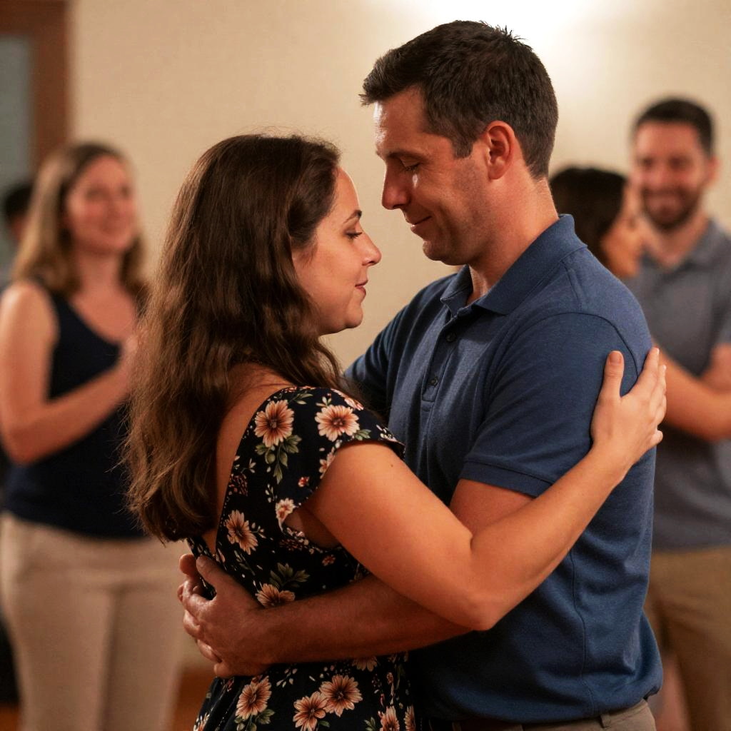 Photograph capturing a warm and intimate moment at a dimly lit party featuring a couple kissing. The woman has blonde hair and is wearing a sleeveless black dress, while the man wears a dark shirt. The background includes two men standing, one in a grey shirt and another in a white shirt, with multicolored Christmas lights adding a festive atmosphere. Two other men with backs to the camera frame the foreground, one in a grey shirt and the other in a white shirt.