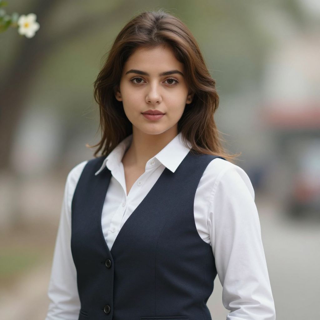 Photograph of a young South Asian woman with medium brown skin and long, straight dark brown hair. She has dark, arched eyebrows, brown eyes, and wears a subtle makeup with pinkish lip color. She is dressed in a sleeveless, black, V-neck top that fits snugly, highlighting her average-sized breasts. She wears small gold hoop earrings and a thin gold necklace. The background is blurred, showing a busy urban street with indistinct figures and greenery. The image has a shallow depth of field, keeping the focus on her face and upper body.