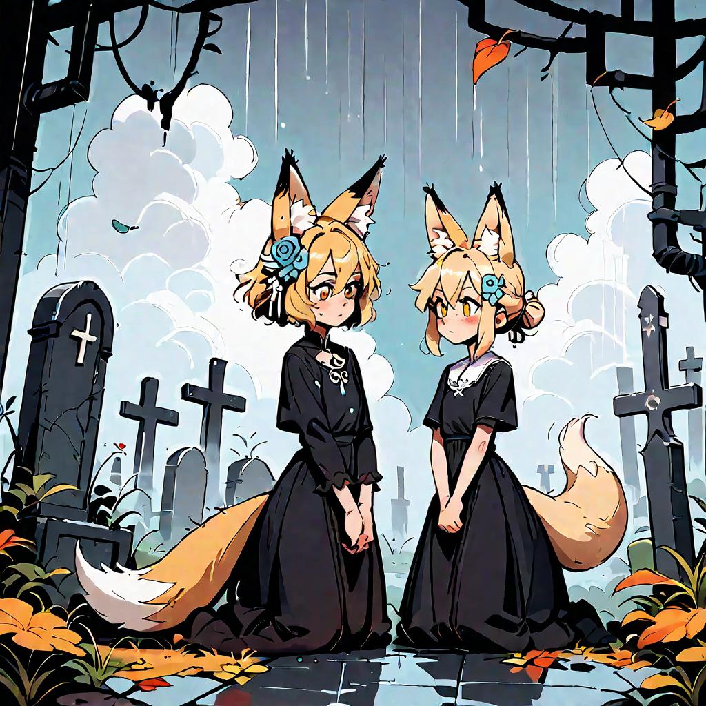 Score_8_up, score_7_up, score_6_up, best quality, masterpiece, uncensored, source_anime, (by ke-ta:0.6)sen, blonde hair, animal ears, fox ears, blush, animal ear fluff, hair ornament, fox girl, hair flower, hair between eyes, short hair, fox tail, (tail:1.5), flat chest, yellow eyes, young girlgraveyard, praying, rain, outdoors, cloudy sky, leaf, ruins, sunbeam, post-apocalypse, black dress