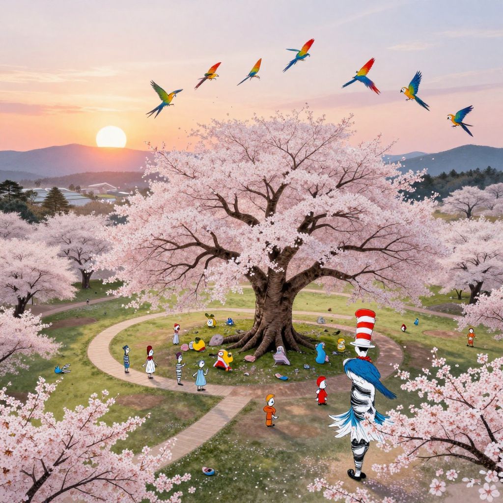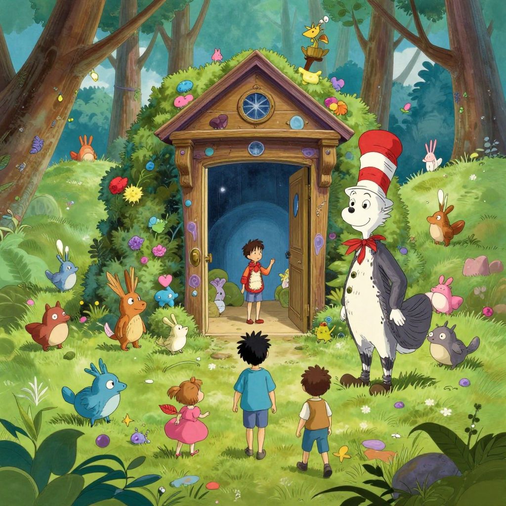 Imagine an aerial view of a whimsical forest, inspired by the vibrant imagination of Dr. Seuss and the surreal intricacies of dreamlike landscapes. The tangled branches form an intricate canopy, inviting viewers to explore the enchanting world below. Creatures made from everyday objects such as teapots, scissors, and clocks inhabit this lively scene, evoking a sense of wonder and curiosity for those who venture into its depths. This fantastical realm encourages viewers to discover hidden stories behind each unique character, blending the whimsy of Seuss with the detailed intricacies of surrealism.