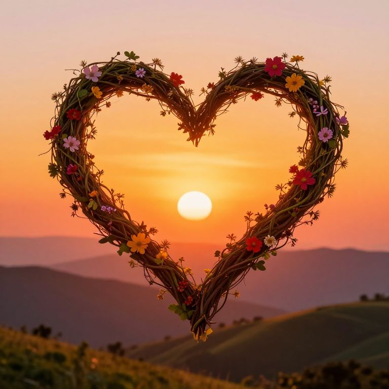 Kasih represented as a radiant heart made of intertwined vines and blooming flowers, set against a vibrant sunrise backdrop over rolling hills, colors blending harmoniously to convey warmth, compassion, and the beauty of unconditional love.