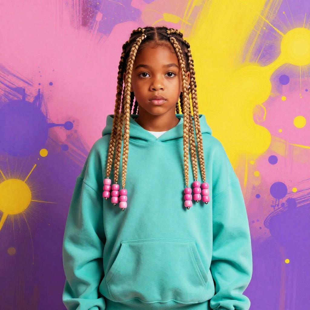 Digital art of a young Black girl with light brown skin and long, blonde braided pigtails adorned with pink beads. She's wearing a loose, teal hoodie over a white shirt, standing against a vibrant, abstract background of pink, yellow, and purple splashes. Her expression is serious, and she looks slightly to the side. The overall style is bold and colorful, with a graffiti-like texture.