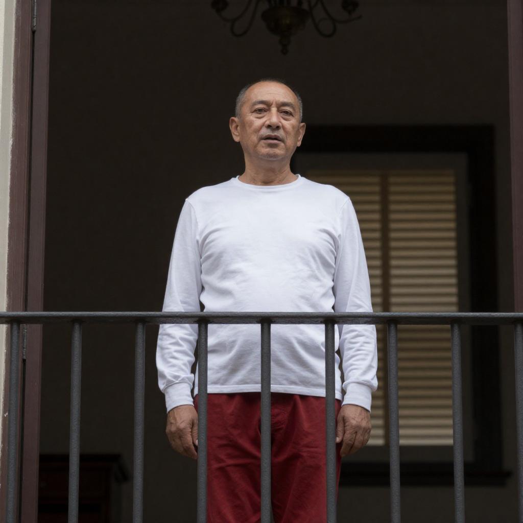A middle-aged man with short hair, wearing a white long-sleeve shirt and red pants, stands on a balcony. He looks forward with a slightly open mouth. Metal railings in front, dimly lit interior behind. Chandelier above. Blinds on window in background.