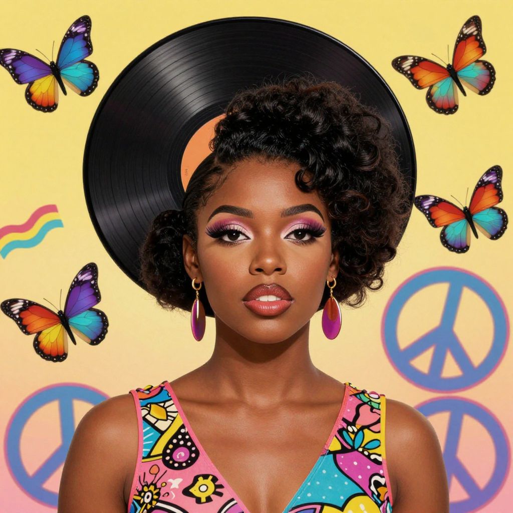 A vibrant digital illustration captures the essence of 1960s soul and funk music, featuring a young Black woman with hair styled like a vinyl record, surrounded by rainbow-colored butterflies, peace symbols, and a retro aesthetic that evokes a nostalgic, high-quality visual experience.