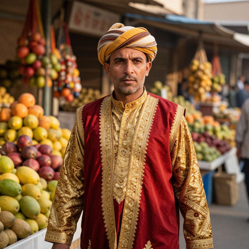 Photograph of a Middle Eastern man standing in a vibrant fruit market. He has a medium build, light brown skin, and a short, salt-and-pepper beard. He wears a traditional, ornately embroidered red and gold kurta with a matching turban featuring yellow and brown stripes. Behind him, colorful fruits including mangoes, oranges, and grapes are displayed in abundance on wooden shelves. The background is slightly blurred, showing more market stalls and indistinct figures. The lighting is bright, highlighting the rich colors and textures of his clothing and the fruits. The overall atmosphere is bustling and lively.