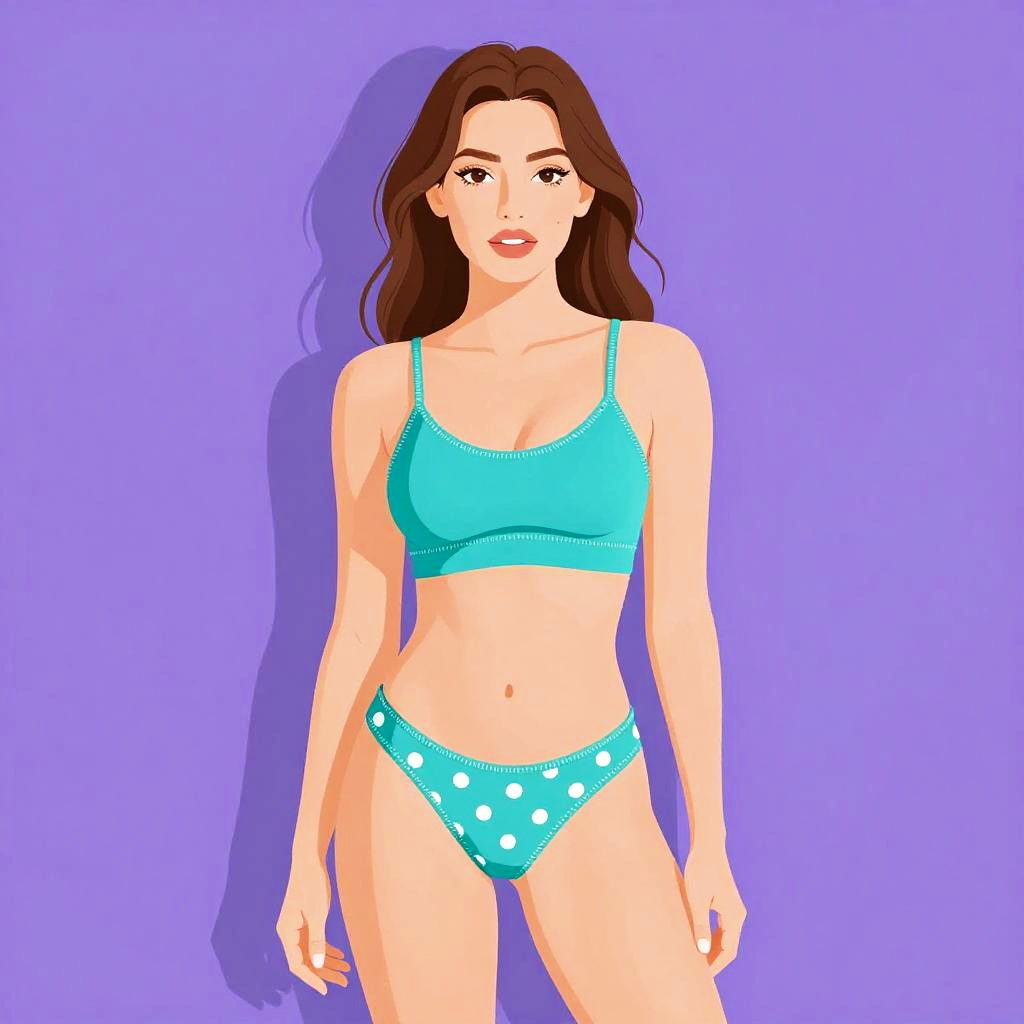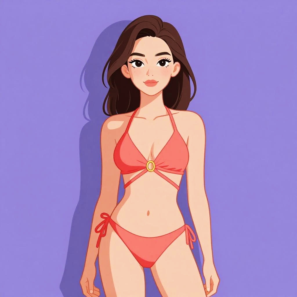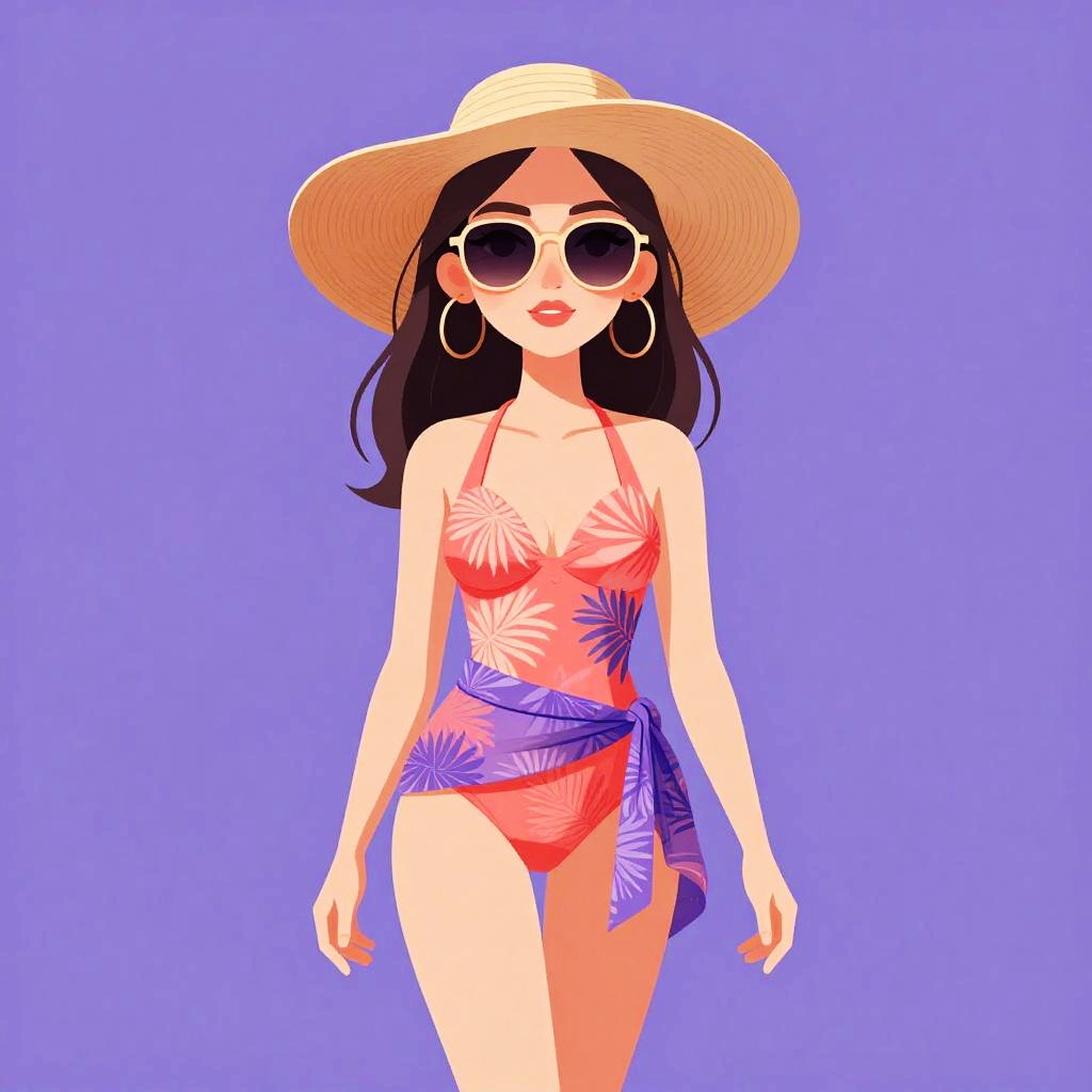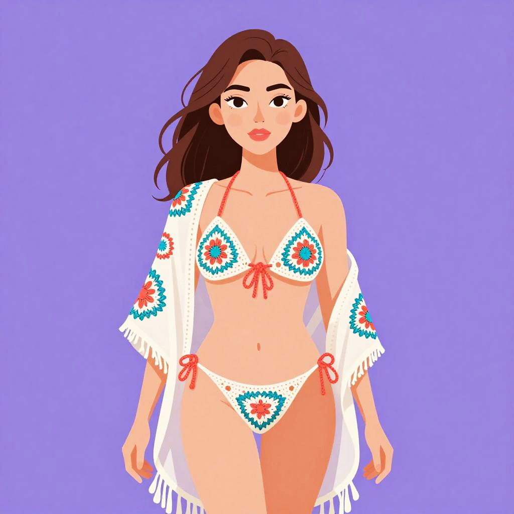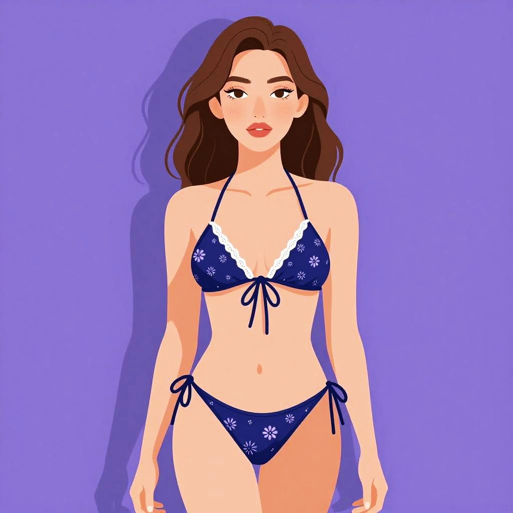 Woman with pretty face and pretty hair. High-waisted bikini, deep navy blue, smooth nylon material, subtle floral print, coordinating beach sweater, airy linen fabric, cropped length, open-knit design, delicate fringe hem, bohemian style, perfect for seaside strolls --sref 1461