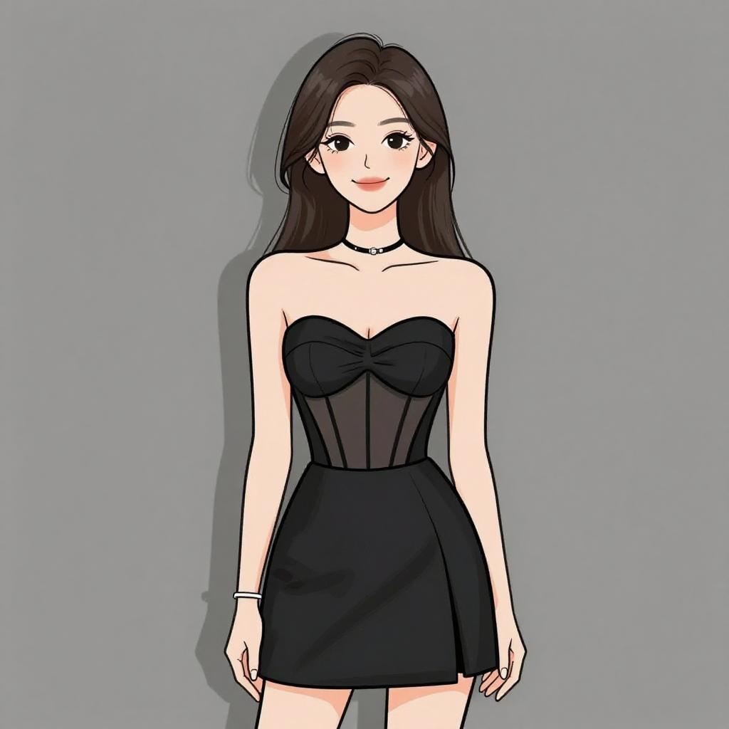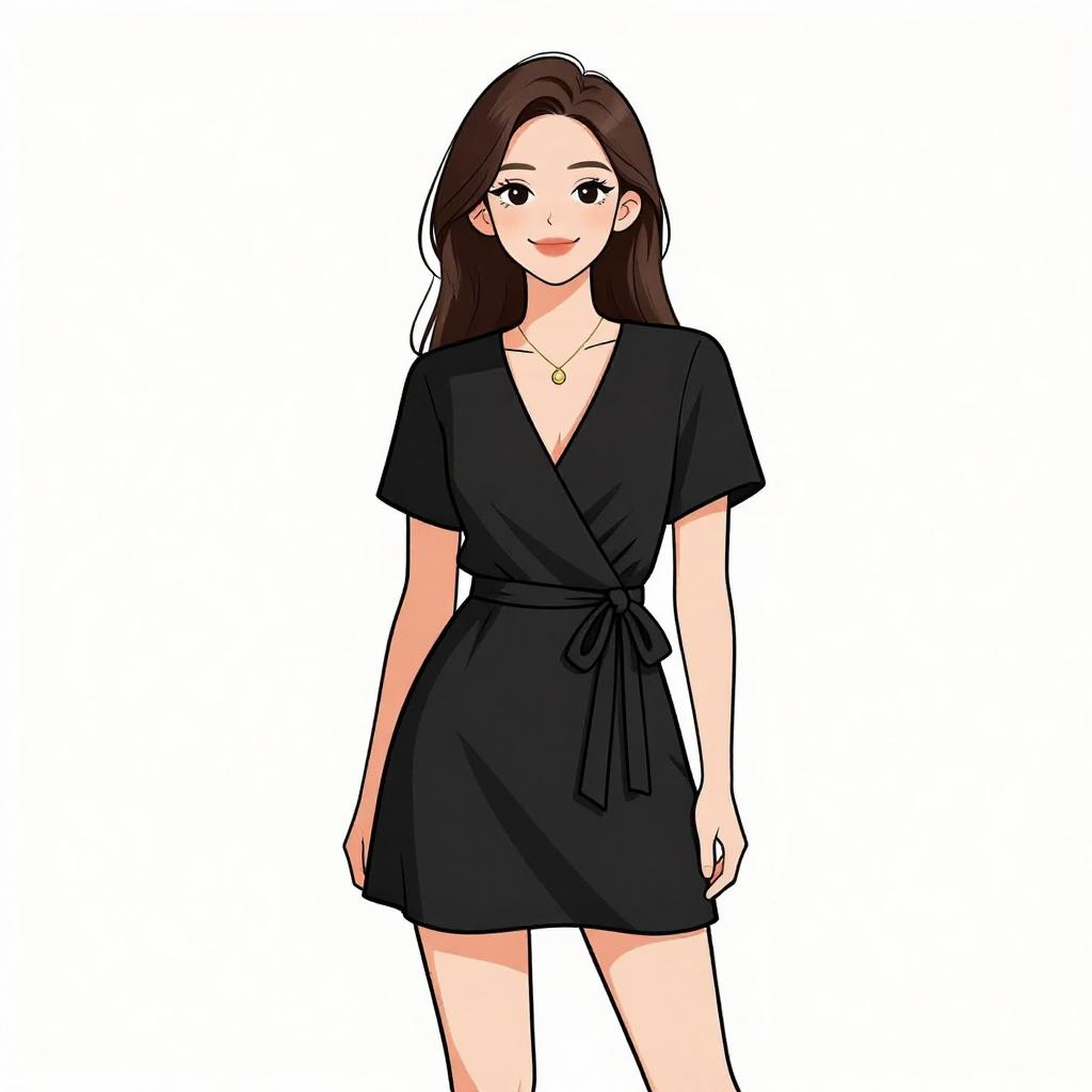 Woman with pretty face and pretty hair. smiling Woman, elegance, black mini dress with a deep V-neckline, oversized batwing sleeves, fitted waist, delicate pendant necklace, minimal makeup, hair down. --sref 1467