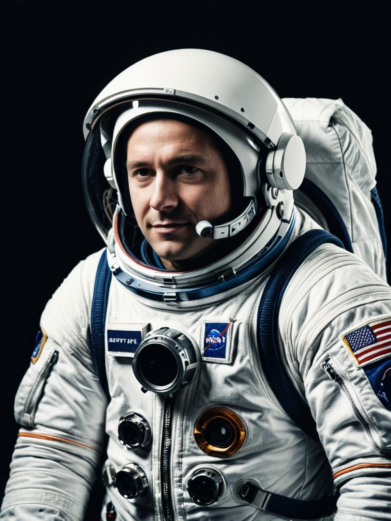 Photorealistic studio portrait of a man wearing a detailed white astronaut suit with NASA patches and an American flag. The subject is facing forward with a serious expression, set against a gradient dark background. The image highlights the intricate elements of the space suit including tubing, gloves, and helmet.