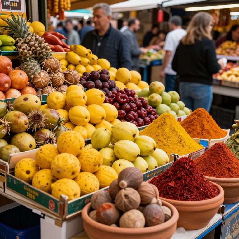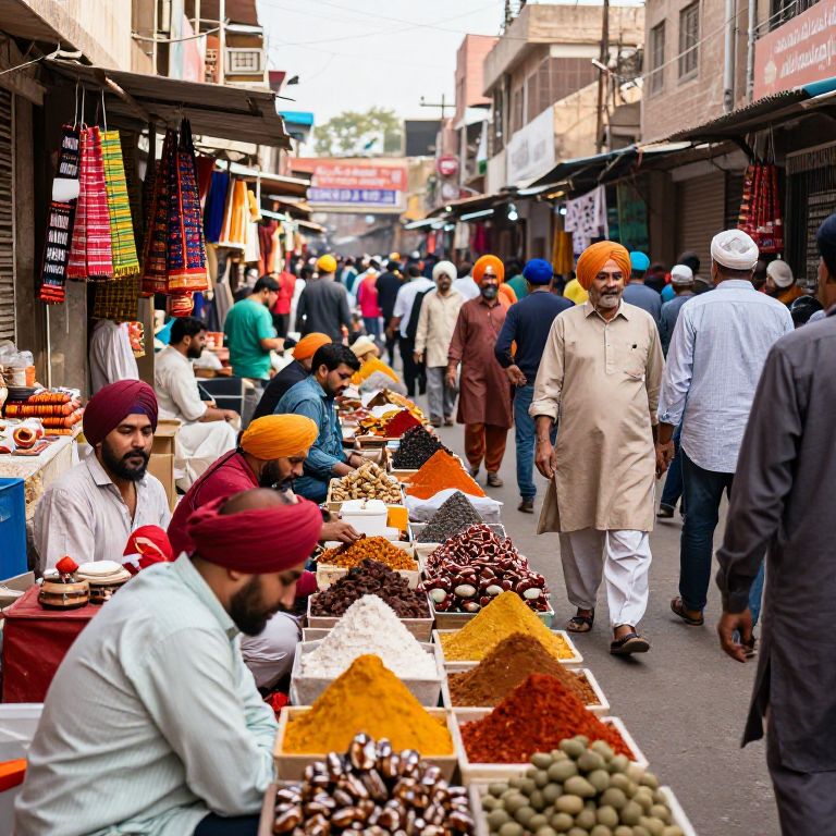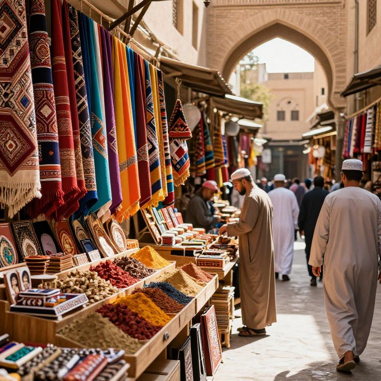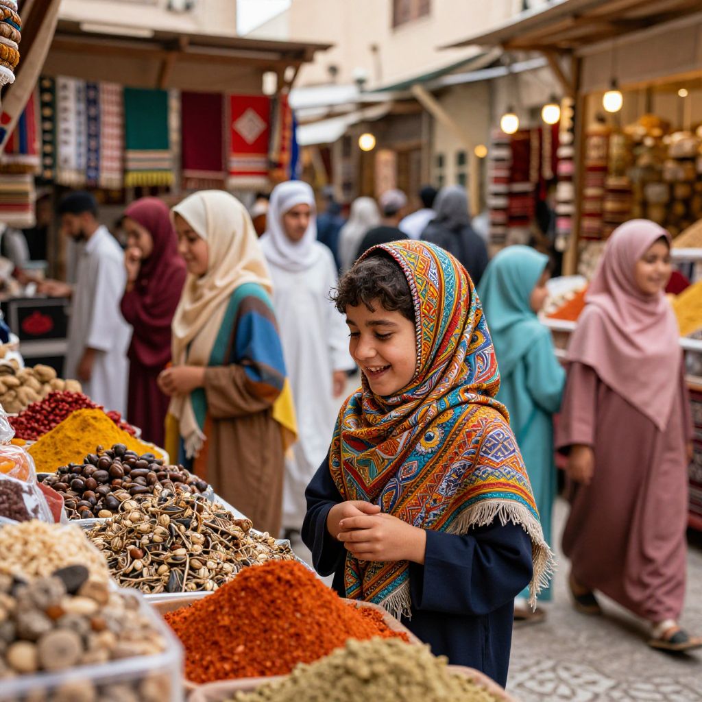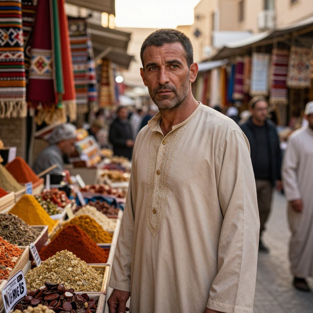 The happy merchant behind a wooden stall with various spices and textiles, bustling market crowd, rich colors, sunlight casting soft shadows, joyful and energetic mood